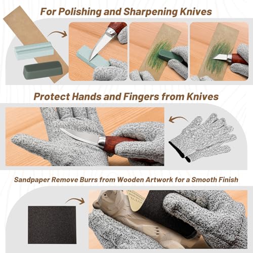 Kit Sculpture Bois, Outil de Ciseaux à Bois Kit, Couteau Sculpture Bois Kit avec Blocs de Sculpture en Tilleul, Sculpture Bois pour Débutants Professionnels, Gants Résistants aux Coupures, Sac Léger
