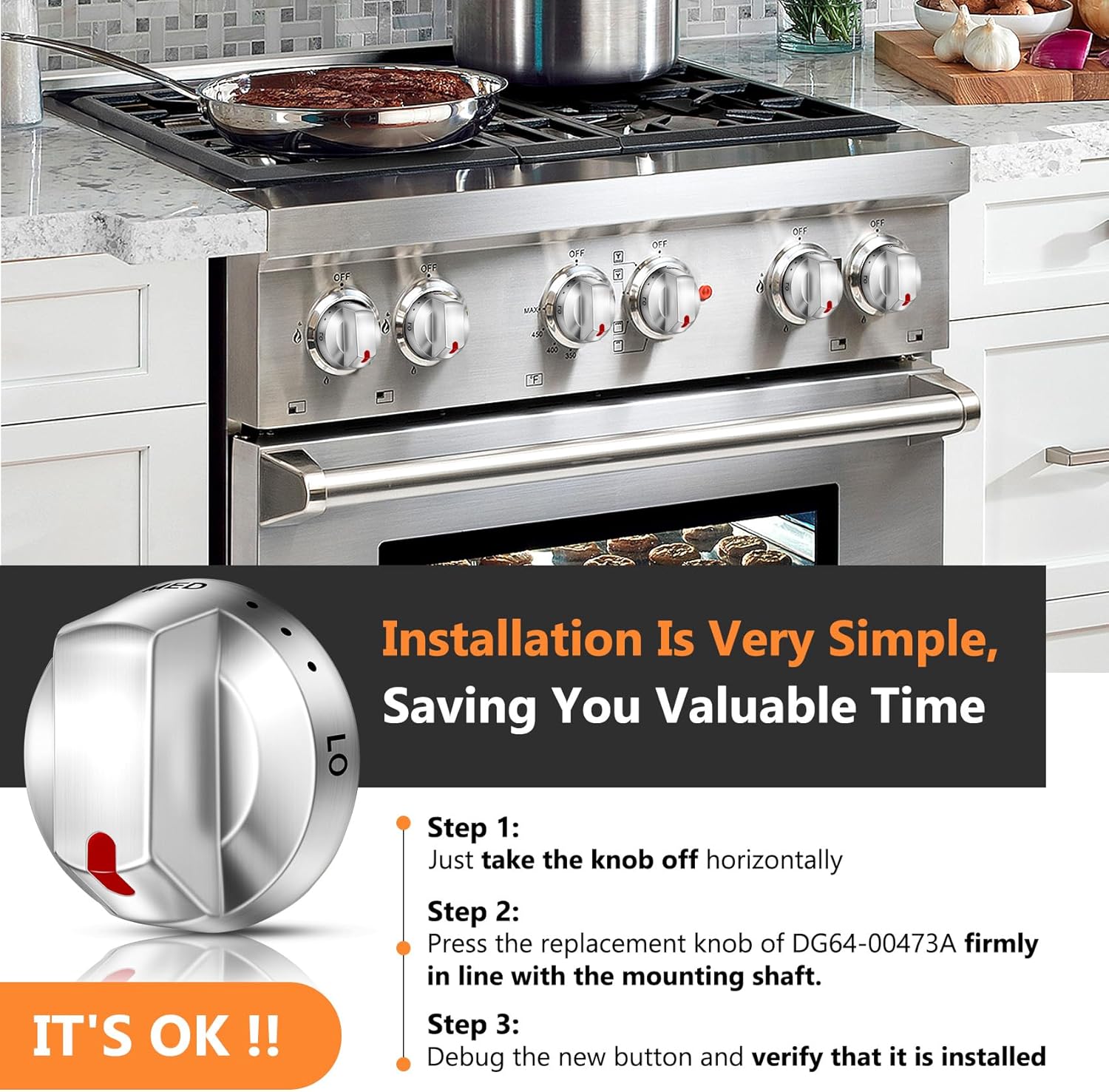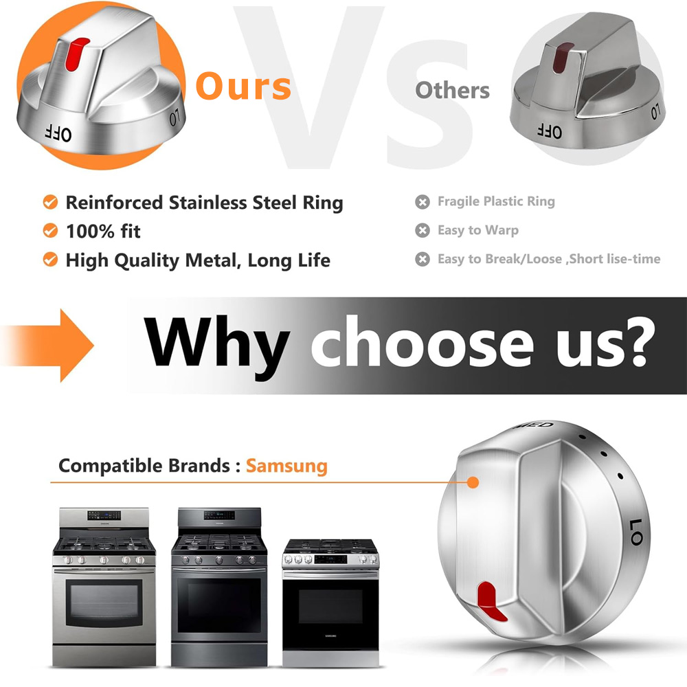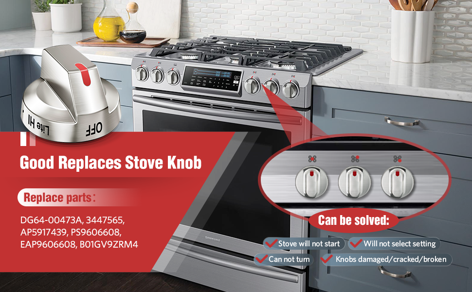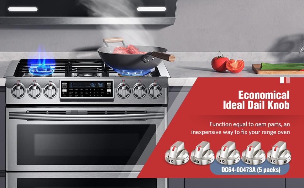 Direct replacement for original Samsung range knobs. This 5-pack of DG64-00473A compatible control knobs restores full functionality to your gas range.While this is NOT a genuine Samsung part, it is a direct replacement and it will appear, fit and work like the factory part.