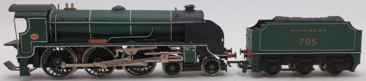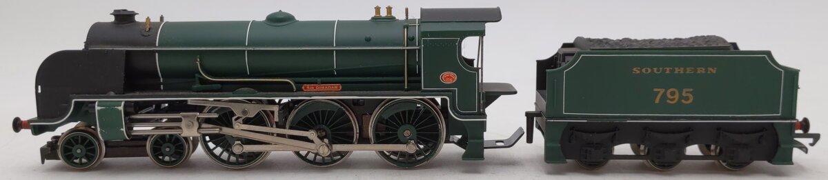 Here is a Hornby R.154 HO Scale Southern Railway Steam Locomotive #795. This item features plastic construction, metal wheels and axles, and plastic couplers.