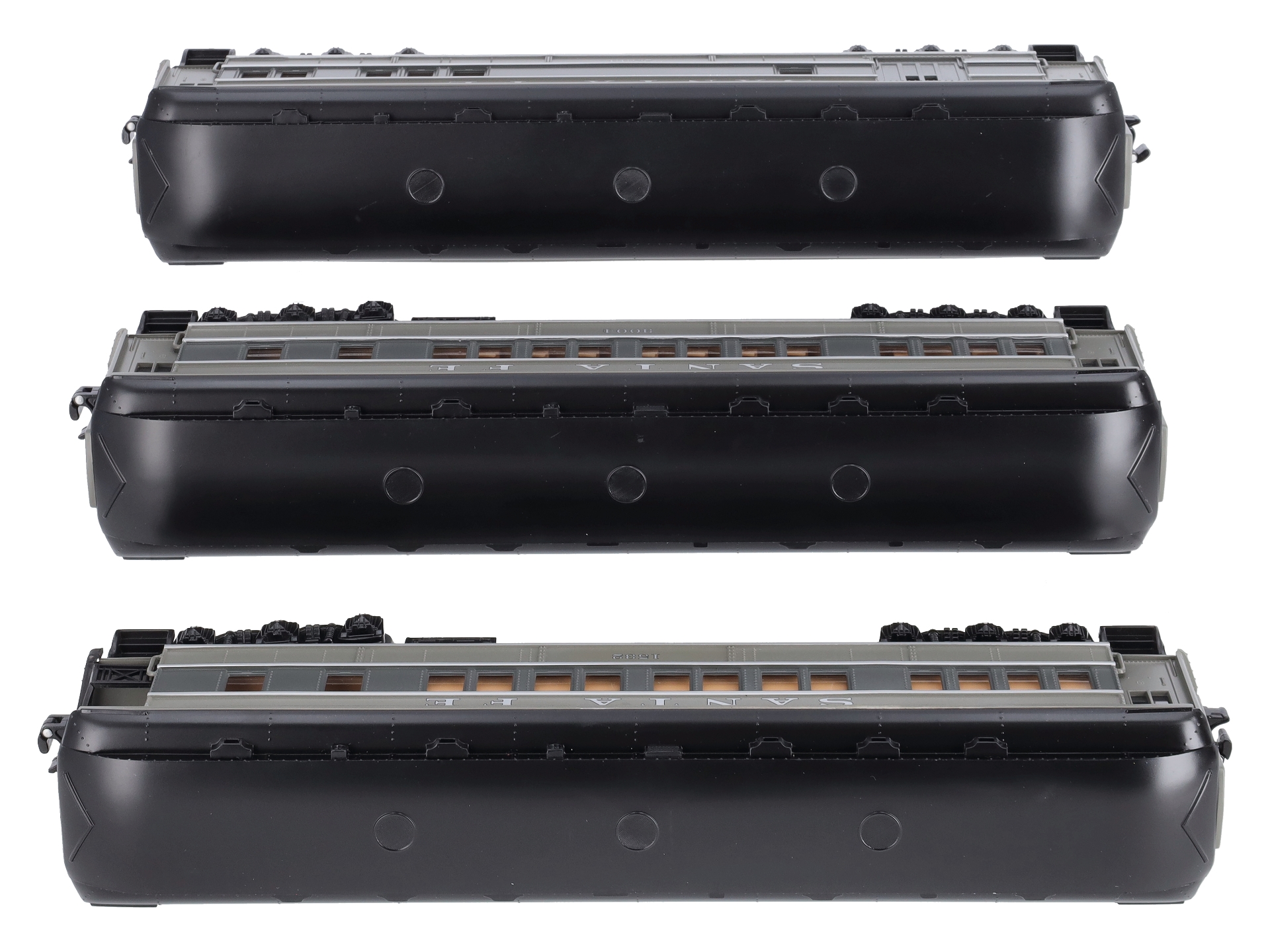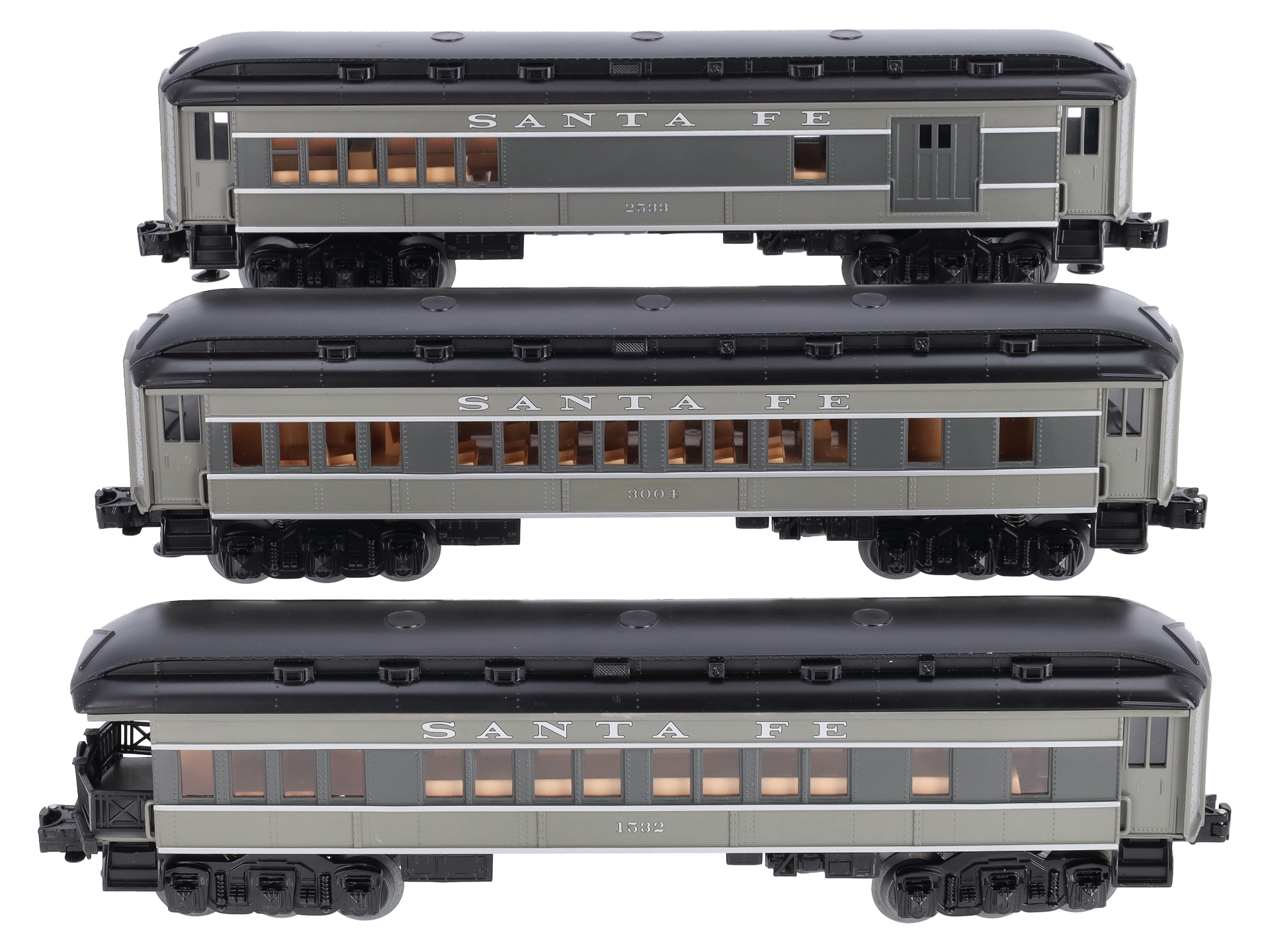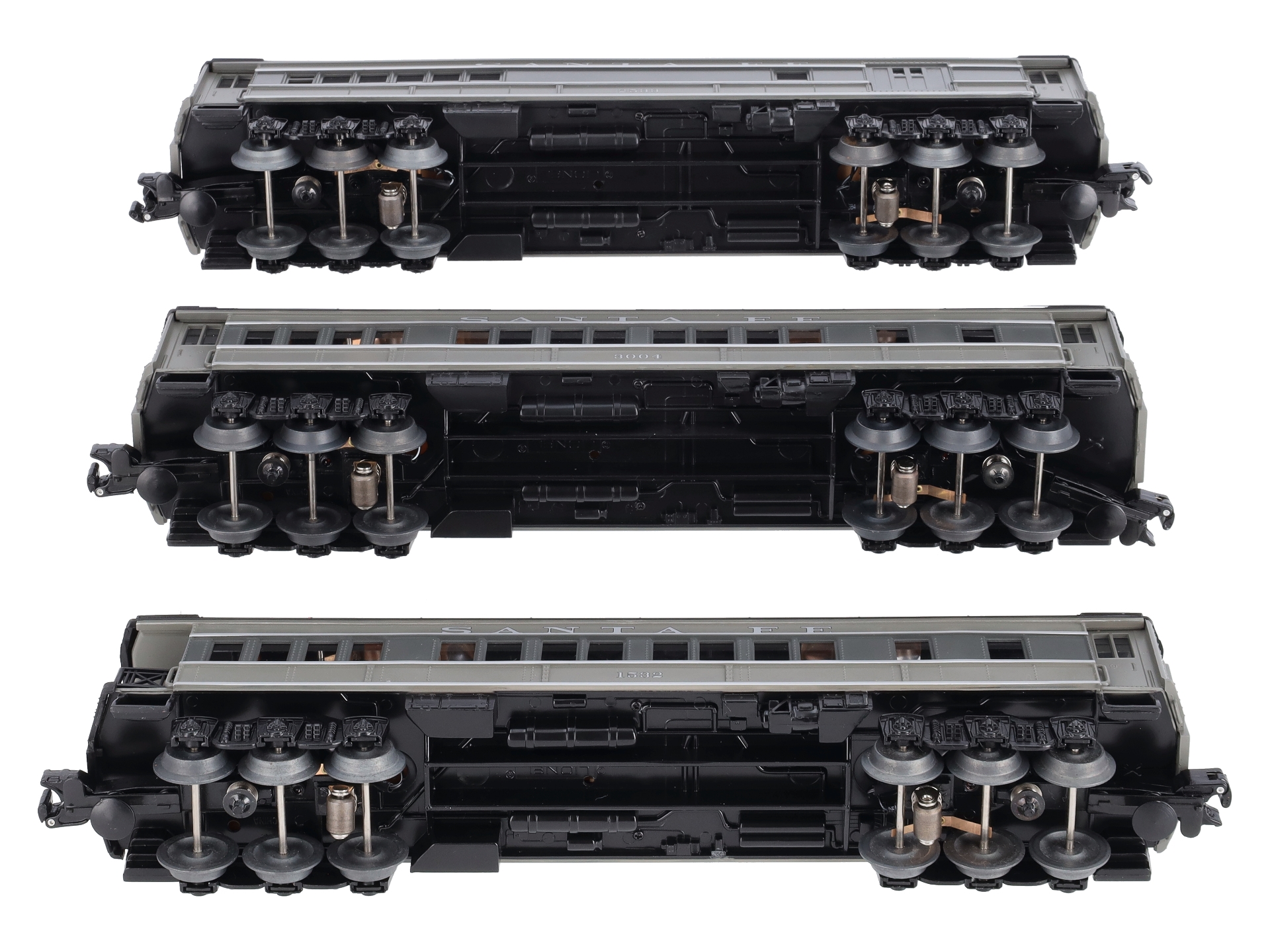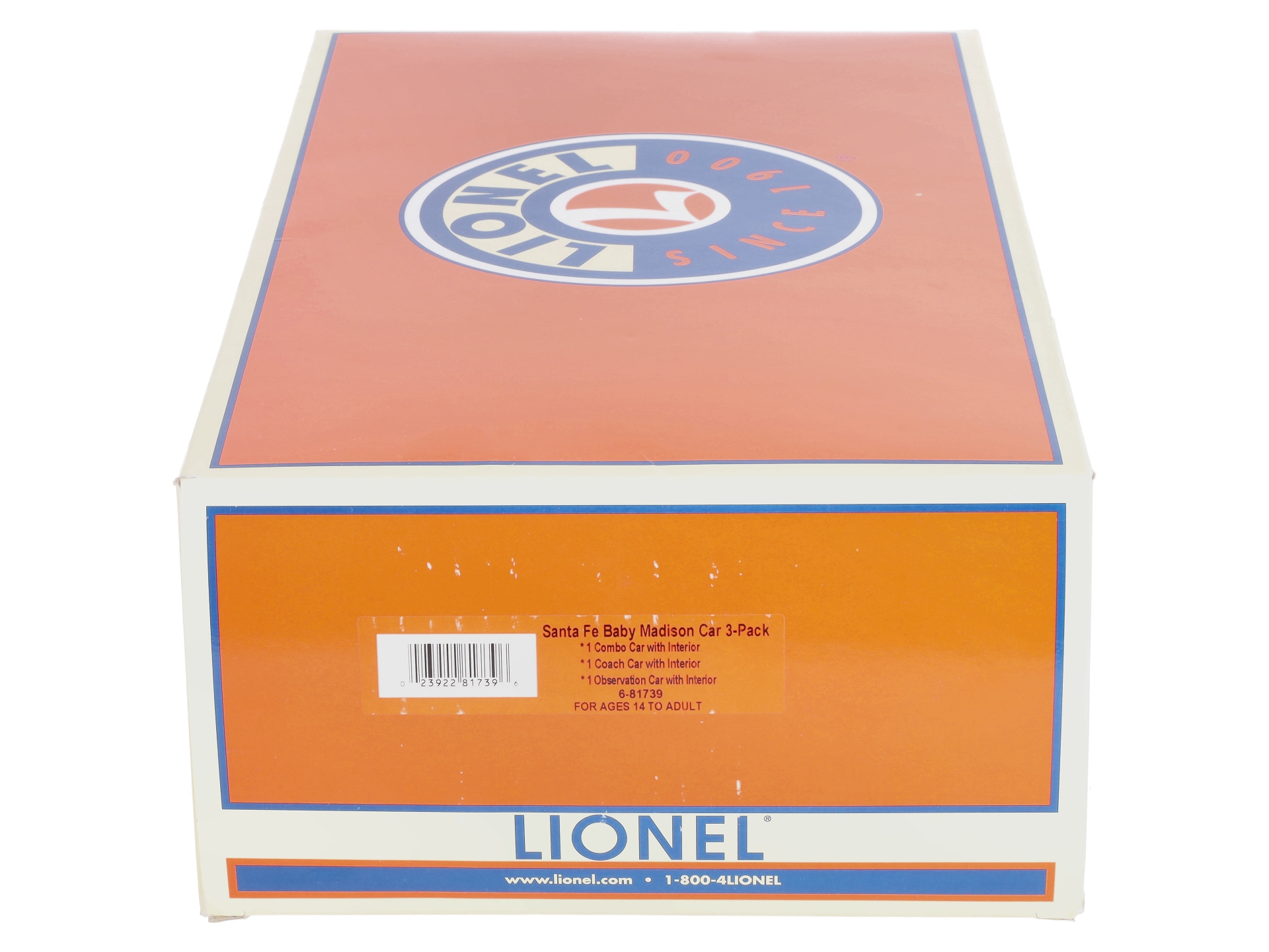 Here is a Lionel 6-81739 O Santa Fe Madison Car 3-Pack. All cars included feature Plastic Construction, Die-cast metal six-wheel trucks, Authentically detailed interiors, Interior illumination, and metal wheels and axles.