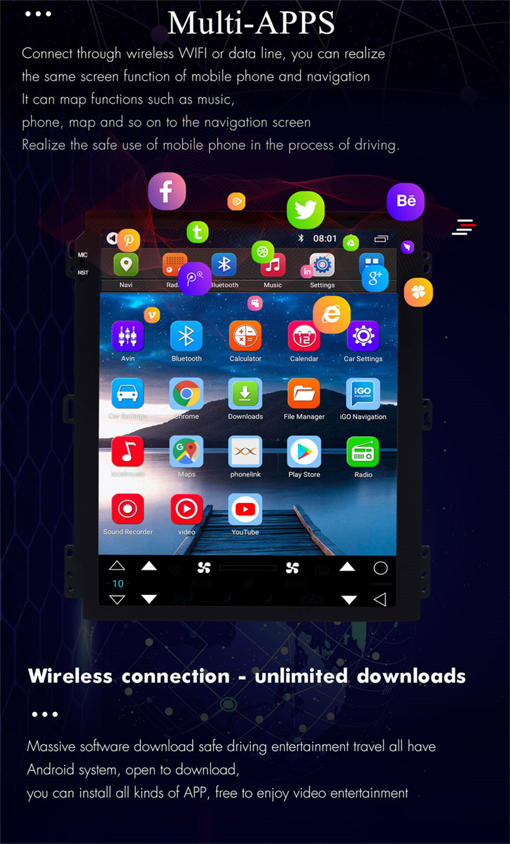 Additional | - Textbook: Could change font, font color, background color, bookmark, reading E-book while listening music - Photo Viewer: Support JPS, BMP, PNG, GIF etc. format. play by revolve, Powerpoint Support 4096*4096 Pixels - Wallpapers: 5 live wallpapers, 17 standard wallpapers, support DIY wallpaper from Gallery - APK Installer: Support Android Package installer - Support Torque Pro(OBD2 &Car): Yes, you can connect a Bluetooth OBD2(Bluetooth version ≥ 4.2) or WIFI OBD2 Scanner Tool to use this function- Support Mirror Link function: Yes, support WIFI screen mirroring from iPhone and android smartphone - Support TPMS: YES (Not Included) -Support Steering Wheel Control;Yes |