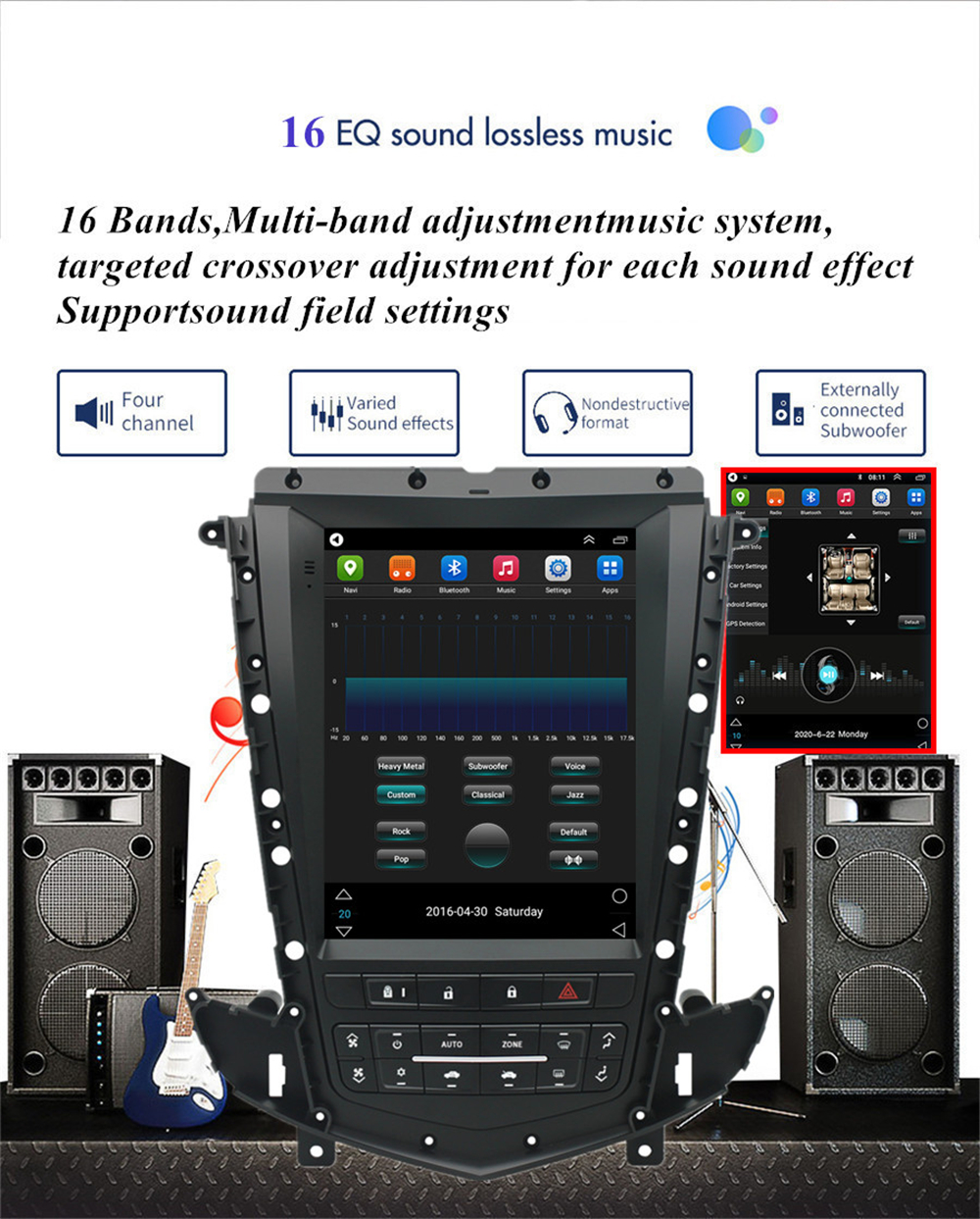 Setup | - WiFi/Hotspot/Bluetooth: Yes - Brightness level adjustable: Yes - Wallpaper: Wallpapers/Live Wallpapers/Gallery - Sound: Key Tone & Volume - Storage: Display Internal Storage/Nand Flash/Connected Device Storage - Apps: Running Apps display/force stop/uninstall - Security: Yes - Accounts: Yes - Languages and Input: more than 70 Languages and choose input method - Backup and Reset: Yes - Date and Time: Setting Date&Time by yourself or choose GPS/network-provided time - Accessibility: Yes - GPS: Yes, GPS application options/monitoring/sound mode/mixing ratio - Driving safety: Watching Video, Reversing X-mirror/Volume, Reversing Trajectory/radar Display, Rear view ruler - Amplifier: Rock/Pop/Jazz/Classic/Flat/Voice/Custom - Steering Wheel Control: Yes - About Device: Display Parameter Info. |