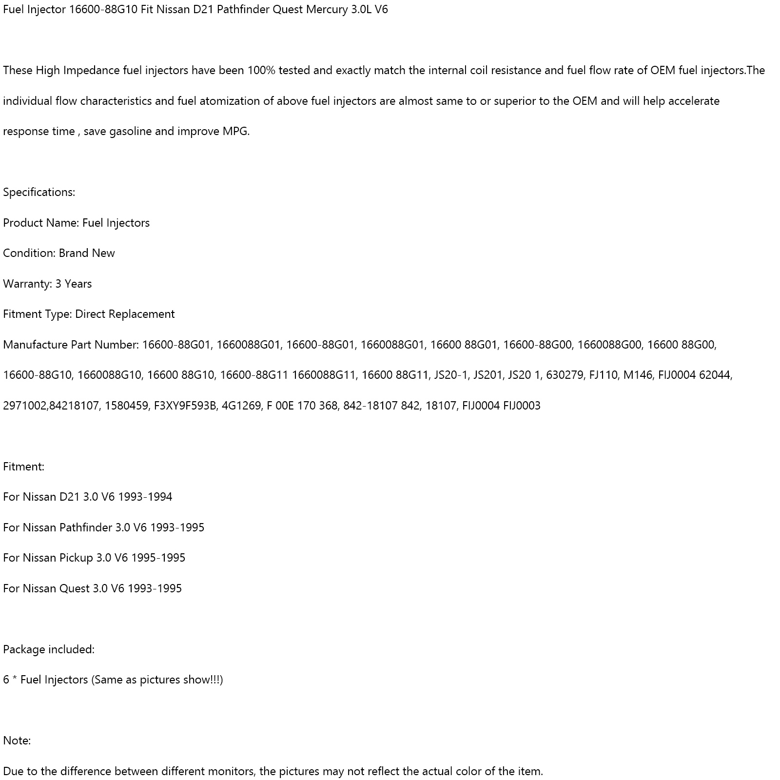 Fuel Injector 16600-88G10 Fit For Nissan D21 Pathfinder Quest Mercury 3.0L V6