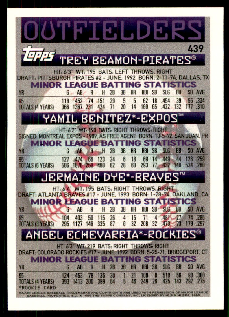 | Description: | Trey Beamon/Yamil Benitez/Jermaine Dye/Angel Echevarria | | Category: | Baseball | | Year: | 1996 | | Product: | Topps | | Team: | Baseball Cards | | Card Number: | 439 | | Dimensions: | 3½" x 2½" |