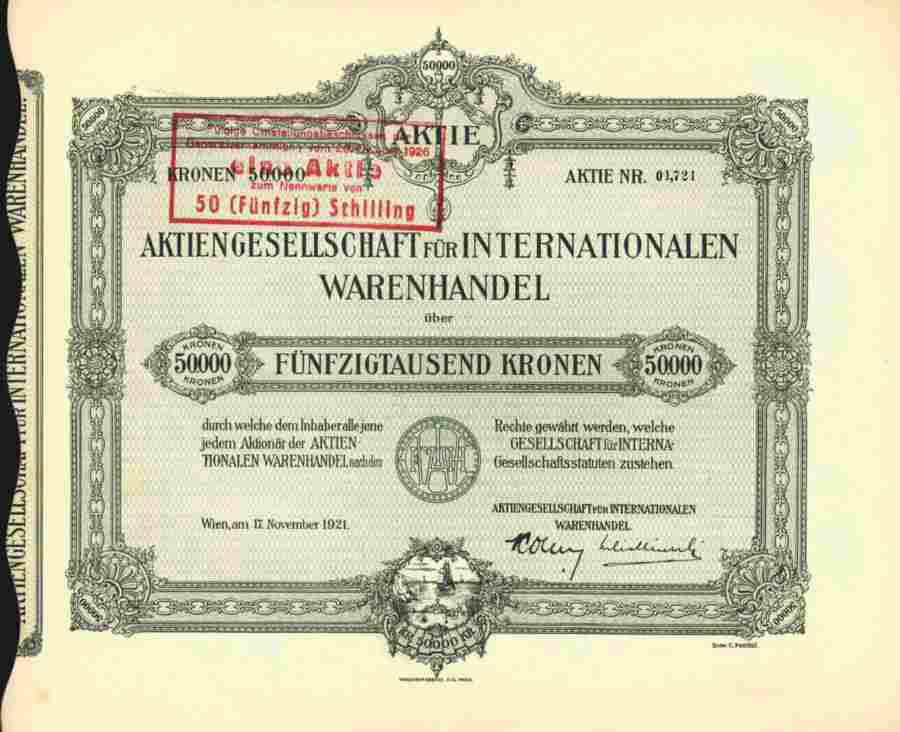 Handels - Aktie - kaum angeboten !!!!! Orginal - Aktie -- siehe Bild - Einzelstück - zu 50.000 Kronen der AG für Internationalen Warenhandel in Wien (Österreich) vom 17. November 1921. Import und Handel mit Waren aller Art. BESONDERHEIT: unentwertete Kupons Nr. 4 bis 18 + Talon anbei. Dekorativ mit Vignette "Segelschiff" unten mittig !! Papier Doppelblatt in guter Erhaltung: VF+. Sammlerfreundlicher Sonderpreis !!
