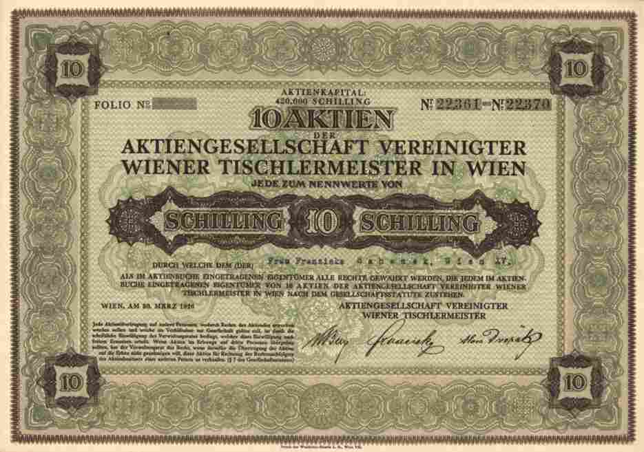 TOP Holz - Aktie #### Orginalaktie -- siehe Archivbild -- der Aktiengesellschaft Vereinigter Wiener Tischlermeister, Wien vom 30. März 1926. Zentrale: Wien VI, Mariahilfer Straße 31. Verkaufslager: Wien XIV, Goldschlagstraße 73. 1922 als Export AG Vereinigter Wiener Tischlermeister gegründet. Ankauf und Übernahme von Tischlereierzeugnissen in Kommission und deren Belehnung im Nebenbetriebe, Export dieser Erzeugnisse und der Verkauf solcher Erzeugnisse im Inland, sowie die Spedition und Einlagerung von Tischlereierzeugnissen und die Errichtung von Lagerstätten. Das Gründungskapitals betrug 100.000 Kronen. 1924 Erhöhung auf 600.000 Kronen und 1926 auf 420.000 Schilling. Nach 1935 geriet die Firma in Schwierigkeiten und wurde mit Schweizer Kapital umstrukturiert. 1937 wurde das Grundkapital auf 180.000 ÖS reduziert. 1939 Veränderungen im Vorstand, sowie eine Kapitalerhöhung auf 180.000 Reichsmark und 1942 auf RM 500.000. 1972 Umfirmierung in Parimpex Handelsgesellschaft m.b.H. Dekorativer Druck von Waldheim Eberle AG in Wien. BESONDERHEIT: Kompletter Kuponbogen unentwetet anbei !! Papier in guter Erhaltung : EF. Aktie im A 4 Format --bestens geeignet für jeden Bilderrahmen !