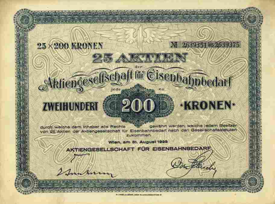 TOP - Eisenbahn -- Einzelstück -- !! Orginalaktie -- siehe Bild -- über 5000 Kronen (25 x 200 Kr.) der Aktiengesellschaft für Eisenbahnbedarf, Wien, Österreich vom 31. August 1923. Gründung zum 1. Juli 1921. Herstellung und Handel von rollendem Material aller Art. Dekorativer Druck von Engel & Söhne in Wien mit geflügeltem Rad oben mittig. Talon mit Kupons Nr. 4 bis 18 komplett anbei !!! Sammlerfreundlicher Sonderpreis !