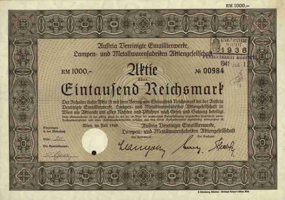 Mit RAREM Stempel "Pénzintézeti Központ" ### Zu erst Eisenbahngesellschaft --- Heute noch tätig ## kaum angeboten !! Orginalaktie -- siehe Archivbild -- der Austria Vereinigte Emaillierwerke, Lampen- und Metallwarenfabriken AG, Wien (Österreich). Aktie über 1000 RM vom Juli 1940. Produktion emaillierter, dekorierter, verzinnter, verzinkter Geschirre aller Art für Haus- und Küchenbedarf, sowie von Aluminium- und Elektrokochgeschirren, Beleuchtungskörper usw. Ursprungsfirma gegründet im Jahre 1855 zwecks Übernahme und Betrieb der staatlichen Eisenbahnen. Zwischen 1891 und 1908 wurden alle Linien der Gesellschaft verstattlicht und die Gesellschaft konzentrierte sich von da an auf ihre Industrieunternehmungen. 1972 Umbenennung in Austria Email. 1979 Einstellung der unrentablen Produktionssparten Emailgeschirr und Sanitärartikel. 1980 Fusion mit der Elin Tochter EHT. Nach Übernahme der Mehrheitsanteile durch die Elin Union wurde die Produktgruppe Warmwassertechnik zum Hauptumsatzträger der Austria Email-EHT-Gruppe. 1981 Umbenennung in Austria Email EHT AG. 1992 Aufgliederung der Geschäftsfelder in eigene Gesellschaften unter der Austria Email AG: Austria Email Wärmetechnik GmbH, Haveltherm Wasser- und Wärmetechnik GmbH, Austria Email Licht- und Umwelttechnik GmbH, Dr. Burg GmbH. 1995 Im Rahmen einer Konzentration auf die Wärmetechnik-Sparte Verkauf der Dr. Burg Vertriebs-GmbH und Austria Email Licht- und Umwelttechnik GmbH. 1996 Umfirmierung der Austria Email Wärmetechnik GmbH in Austria Email AG. BESONDERHEIT: Mit ungarischem Besitz/Steuerstempel von 1936 und 1941. (Nur wenige Stücke wurden gefunden). Firmenemblem geprägt im Trockensiegel.