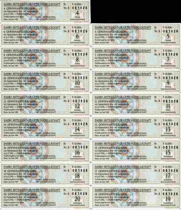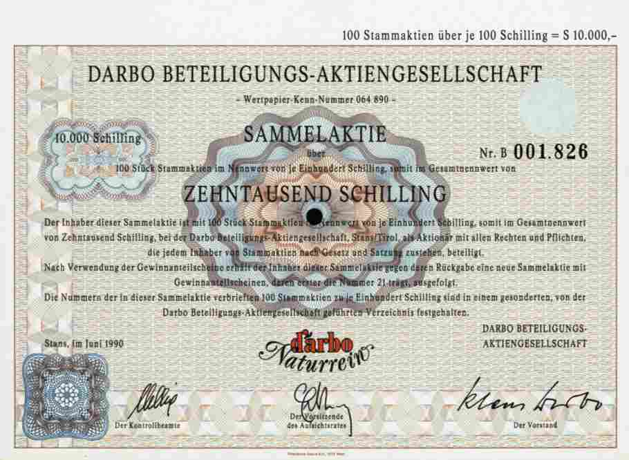 SÜSSE - AKTIE der DARBO --- Höchster Nennwert###### Orginalaktie -- siehe Archivbild -- über 10.000 Schilling der DARBO Beteiligungs AG, Stans im Juni 1990. Man schrieb das Jahr 1879, als Rudolf Darbo in Görz mit seinem "Obst-Dampfwerk" den Grundstein zu jenem Unternehmen legte, das heute zu den erfolgreichsten in Österreich zählt. Ein halbes Jahrhundert später verlegte sein Sohn Adolf Darbo den Standort in das tirolerische Stans und konzentrierte sich von nun an auf die Herstellung von hochwertigen Sirupen und auf die Abfüllung von Honig. 1970 ging der Familienbetrieb mit Klaus Darbo in die dritte Generation. Der Markenname "DARBO NATURREIN" wurde geboren. Der Begriff "Naturrein" wurde zum Qualitätsmaßstab bei Konfitüren. Nach wenigen Jahren war Darbo die beliebteste Konfitüre Österreichs. Heute ist Darbo ein führendes Lebensmittelunternehmen Österreichs. Firmenemblem unten mittig . Papier , Gewinnanteilscheine anhängend. Dekorativer Druck von Pillerdruck in Wien. FS Unterschrift von Klaus Darbo. Sammlerfreundlicher Sonderpreis !