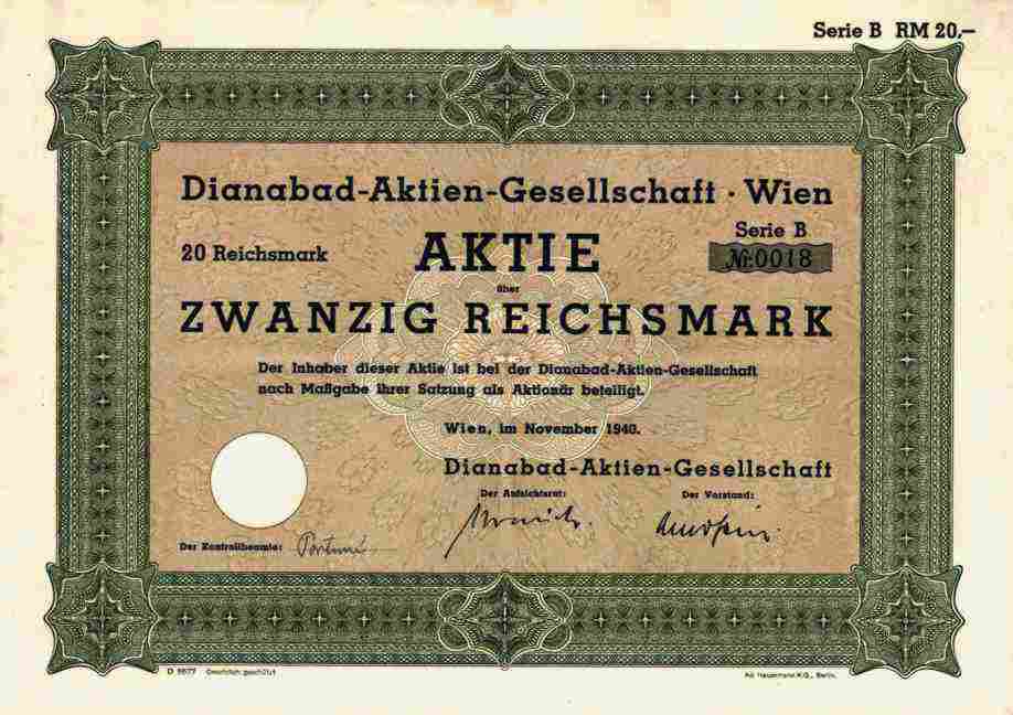 TOP - Wellness - Aktie - kaum angeboten !!!!! sehr kleine Stückzahl - weniger als 14 Stücke ##### Orginal - Aktie -- siehe Archivbild -- der Dianabad AG, Wien (Österreich) Aktie über 20 RM vom November 1940. Bade- und Kurbetrieb. Gegründet 1804; AG seit 1840. Anlagen: Die in den Jahren 1913 bis 1917 erbaute Anstalt umfaßte zwei Dampfbäderabteilungen mit 429 Kabinen, 73 Wannenbäder, zwei gedeckte Schwimmhallen mit 793 Kabinen und Sonnenbäder mit 258 Kabinen. Die größere der Schwimmhallen war mit einer Wellenbadeanlage ausgestaltet, während die andere Halle auch für Abhaltung von sportlichen Veranstaltungen größten Ausmaßes ausgebaut war. Die Kuranstalt setzte sich aus Abteilungen für Elektrotherapie, Wasser-, Heißluft-, Radium-, Inhalationskuren, Medizinbäder, alle Arten von Strahlenbehandlungen, Moor-, Schlamm-, Ischiasschnellkuren und Paraffinpackungen, Zandern, Ringrollermassage usw. zusammen. Einen großen Raum nahmen in den Einrichtungen auch die Sportanlagen ein; sie bestanden aus je einer neuzeitlich ausgestatteten Turn- und Boxschule. Dem Bad waren angeschlossen ein Hotel (1938 in Eigenregie übernommen) und ein Kaffeehaus. Seit 1938 war auch das KdF-Strandbad an der Alten Donau in die Verwaltung der Gesellschaft eingegliedert. 1941 Erwerb des Hotel "Berliner Hof", Königswinter a. Rh. 1946 Teil des USIA-Konzern (Uprawlenije Sowjetskim Imuschtschestwom w Awstriji = Verwaltung des sowjetischen Eigentums in Österreich), der aus mehr als 300 Unternehmen, die von der Sowjetunion 1946 in der sowjetischen Besatzungszone in Österreich als Eigentum des deutschen Reiches beschlagnahmt wurden, bestand. 1955 Übergabe an den österreichischen Staat. Dekorativer Druck von AD. Haussmann in Berlin. Übliche Lochentwertung, Papier in guter Erhaltung: EF.
