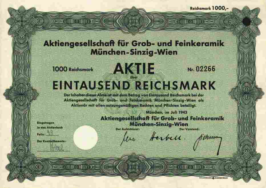 Ein Stück Keramikgeschichte - Wiener Ziegelwerke !! Die RARE 1000er -- kleine Auflage !!! Orginalaktie -- siehe Archivbild -- der AG für Grob- und Feinkeramik, München - Sinzig - Wien. Aktie über 1000 RM vom Juli 1943. Herstellung von Ton- und Porzellanwaren. Gegründet am 10.1.1867 unter Übernahme der Firma Reinhold Hirschberg & Co., Steinhausen als Actien-Ziegelei München. 1943 Verschmelzung mit der Vereinigte Mosaik- und Wandplattenwerke AG, Friedland-Sinzig-Ehrang (gegr. 1868) und Firmenänderung in AG für Grob- und Feinkeramik. Am 6.7. 1942 Übernahme der AG der Wiener Ziegelwerke. 1955 Erwerb der ältesten kanadischen Porzellanfabrik. Ab 1958: AGROB AG für Grob- und Feinkeramik. Ende der 1990er-Jahre wurde der Keramikbereich der nunmehrigen AGROB an Villeroy und Boch verkauft. Heute besteht der Firmenzweck nur noch in der Verwertung des großen Werksgeländes in Ismaning bei München. Logo geprägt im Trockensiegel. Papier mit der üblichen Lochentwertung, Papier, in guter Erhaltung : EF. Aktie im A 4 Format --bestens geeignet für jeden Bilderrahmen !!!