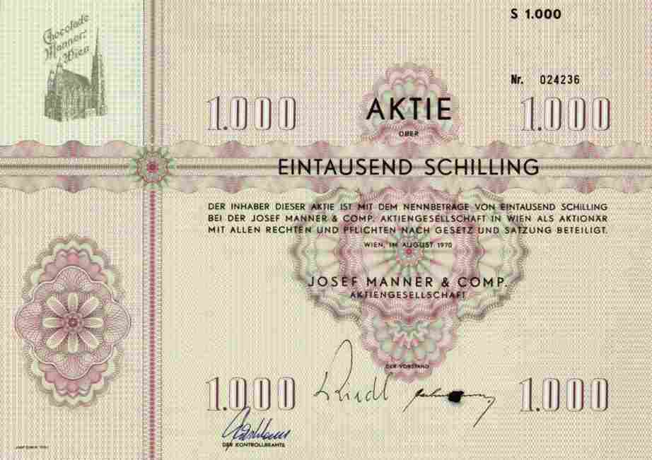 SÜSSE - AKTIE der Josef Manner ###### Orginalaktie -- siehe Archivbild -- über 1000 Schilling der Josef Manner & Comp. AG, Wien (Österreich). Aktie über 1000 Schilling (ÖS) vom August 1970. Erzeugung von Schokolade-, Zucker- und Dauerbackwaren sowie sonstiger Lebensmittel aller Art und aller daraus herzustellenden oder zu deren Herstellung und Vertrieb dienenden Artikel und Materialien sowie der Handel mit allen sonstigen Fabrikaten für eigene und fremde Rechnung. Erzeugnisse: Kakao, Schokolade, Pralinen, Zuckerwaren, Fruchtsäfte, Marmelade, Dauerbackwaren. Gegründet am 23.10.1913 durch Umwandlung der seit 1890 bestehenden Firma Josef Manner & Comp. in eine Aktiengesellschaft.1970 erfolgte die Fusion mit dem zweitgrößten Süßwarenunternehmen, der Firma Napoli, Ragendorfer und Co mit den Marken Napoli und Casali. 1996 wurde die Firma Walde Candita übernommen. Heute ist die Josef Manner & Comp. AG der größte rein österreichische Süßwarenproduzent. Besonderheit: Dekorativer Druck mit dem Stephansdom in Wien oben links. Manner ist übrigens die einzige Firma die mit dem Stephansdom werben darf !!!! Papier lochentwertet in sehr guter Erhaltung: EF. FS Unterschriften der Vorstände. Sammlerfreundlicher Sonderpreis !