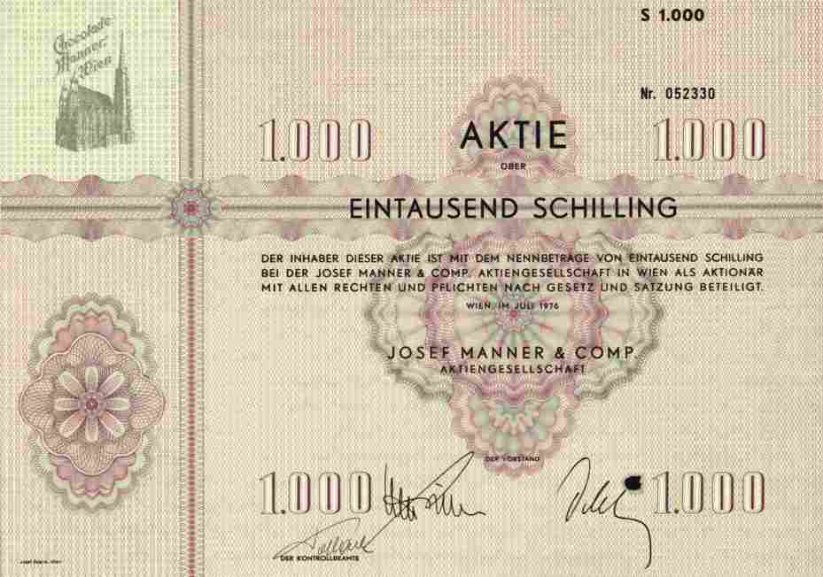 SÜSSE - AKTIE der Josef Manner ###### Orginalaktie -- siehe Archivbild -- der Josef Manner & Comp. AG, Wien (Österreich). Aktie über 1000 Schilling (ÖS) vom Juli 1976. Erzeugung von Schokolade-, Zucker- und Dauerbackwaren sowie sonstiger Lebensmittel aller Art und aller daraus herzustellenden oder zu deren Herstellung und Vertrieb dienenden Artikel und Materialien sowie der Handel mit allen sonstigen Fabrikaten für eigene und fremde Rechnung. Erzeugnisse: Kakao, Schokolade, Pralinen, Zuckerwaren, Fruchtsäfte, Marmelade, Dauerbackwaren. Gegründet am 23.10.1913 durch Umwandlung der seit 1890 bestehenden Firma Josef Manner & Comp. in eine Aktiengesellschaft.1970 erfolgte die Fusion mit dem zweitgrößten Süßwarenunternehmen, der Firma Napoli, Ragendorfer und Co mit den Marken Napoli und Casali. 1996 wurde die Firma Walde Candita übernommen. Heute ist die Josef Manner & Comp. AG der größte rein österreichische Süßwarenproduzent. Besonderheit: Dekorativer Druck mit dem Stephansdom in Wien oben links. Manner ist übrigens die einzige Firma die mit dem Stephansdom werben darf !!!! Papier lochentwertet in sehr guter Erhaltung: EF. FS Unterschriften der Vorstände. Sammlerfreundlicher Sonderpreis !