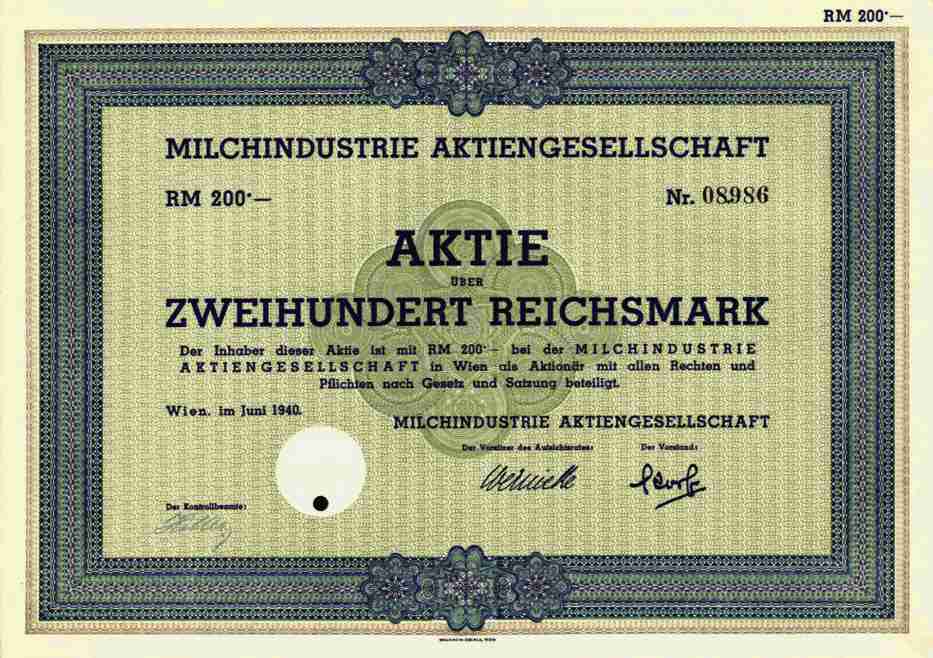 Milch - Aktie - kaum angeboten !!!!! geringe Stückzahl ##### Orginal - Aktie -- siehe Archivbild -- der Milchindustrie AG, Wien (Österreich). Aktie über 200 RM vom Juni 1940. Fabriksmäßiger Molkereibetrieb. Spezialprodukte: Trockenmilch, Kondensmilch, Eiskreme, Eislutscher, Milchgelee, Schmelzkäse, Suppenwürze. Gegründet am 21.12.1928 durch Umwandlung der Zweigniederlassung Wien der Milch-Industrie AG Prag in eine selbständige Gesellschaft. Die Gesellschaft besaß Einrichtungen für eine Verarbeitungskapazität von täglich 200.000 Litern. Die tägliche Verarbeitung betrug 1943 ca. 150.000 Liter Milch. Betriebsanlagen (1943): Es wurden 140 eigene Verkaufsstellen und 500 Milchsondergeschäfte in Wien unterhalten. 1960 übernimmt Unilever das Eisgeschäft der MIAG. 1977 wurde die MIAG mit der "Blau-gelb" Warenvertriebsgesellschaft NÖM sowie mit WIMO und der Wiedner Molkerei Johann Trösch fusioniert. Übliche Lochentwertung, Papier in guter Erhaltung: EF. Sammlerfreundlicher Sonderpreis !!