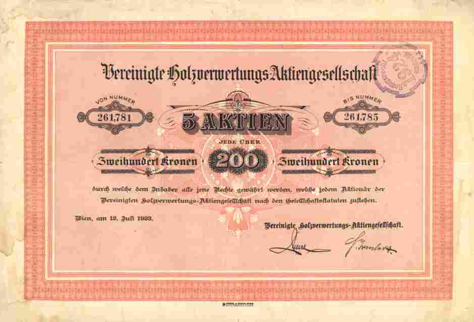 !! RARE Holz - Aktie ungelocht !!!! Orginalaktie -- Siehe Bild -- Einzelstück -- zu 1000 Kronen (5 x 200 Kr.) der Vereinigte Holzverwertungs AG in Wien vom 12. Juli 1923. Großformatiger dekorativer Druck von Emil M. Engel & Söhne, Wien. Sammlerfreundlicher Sonderpreis !