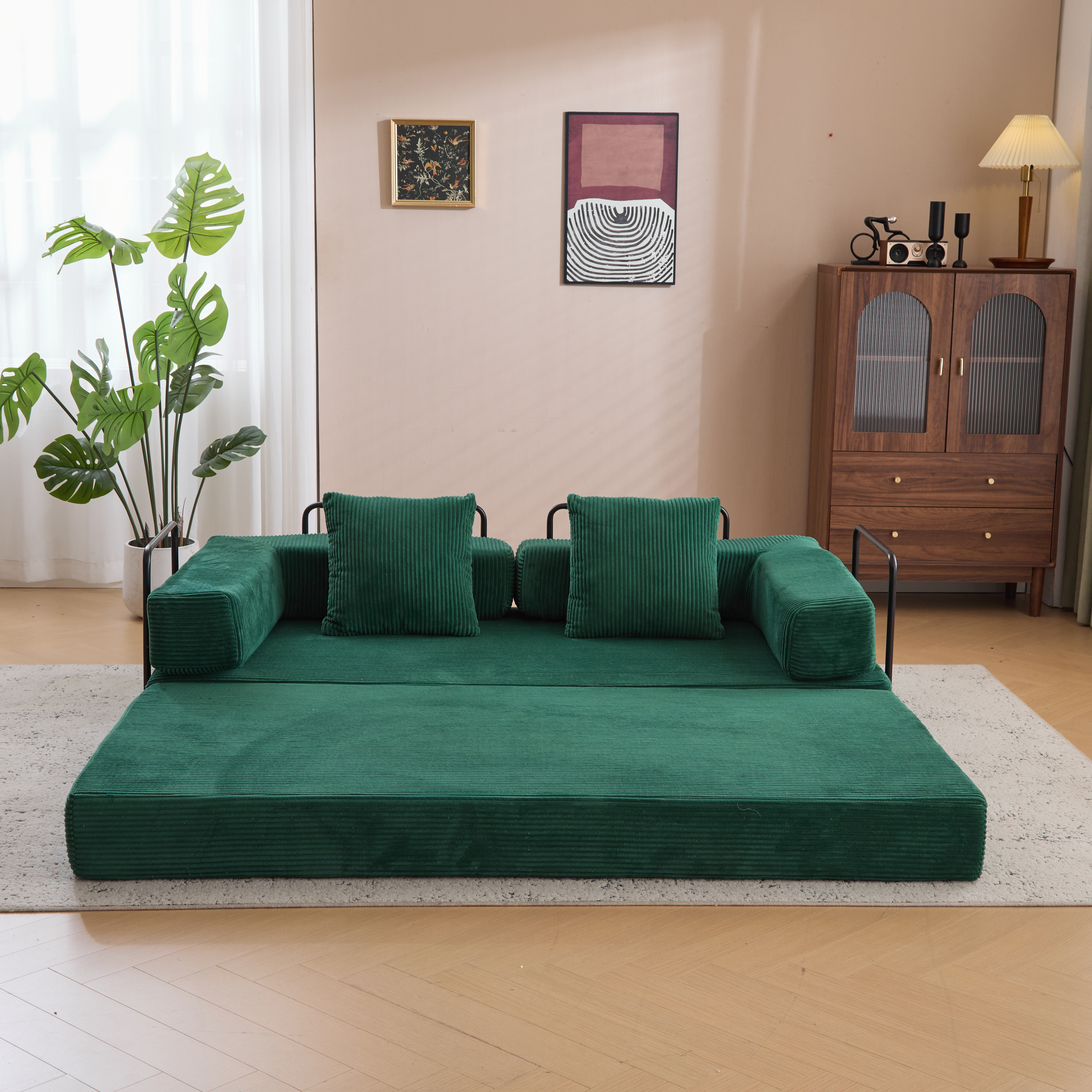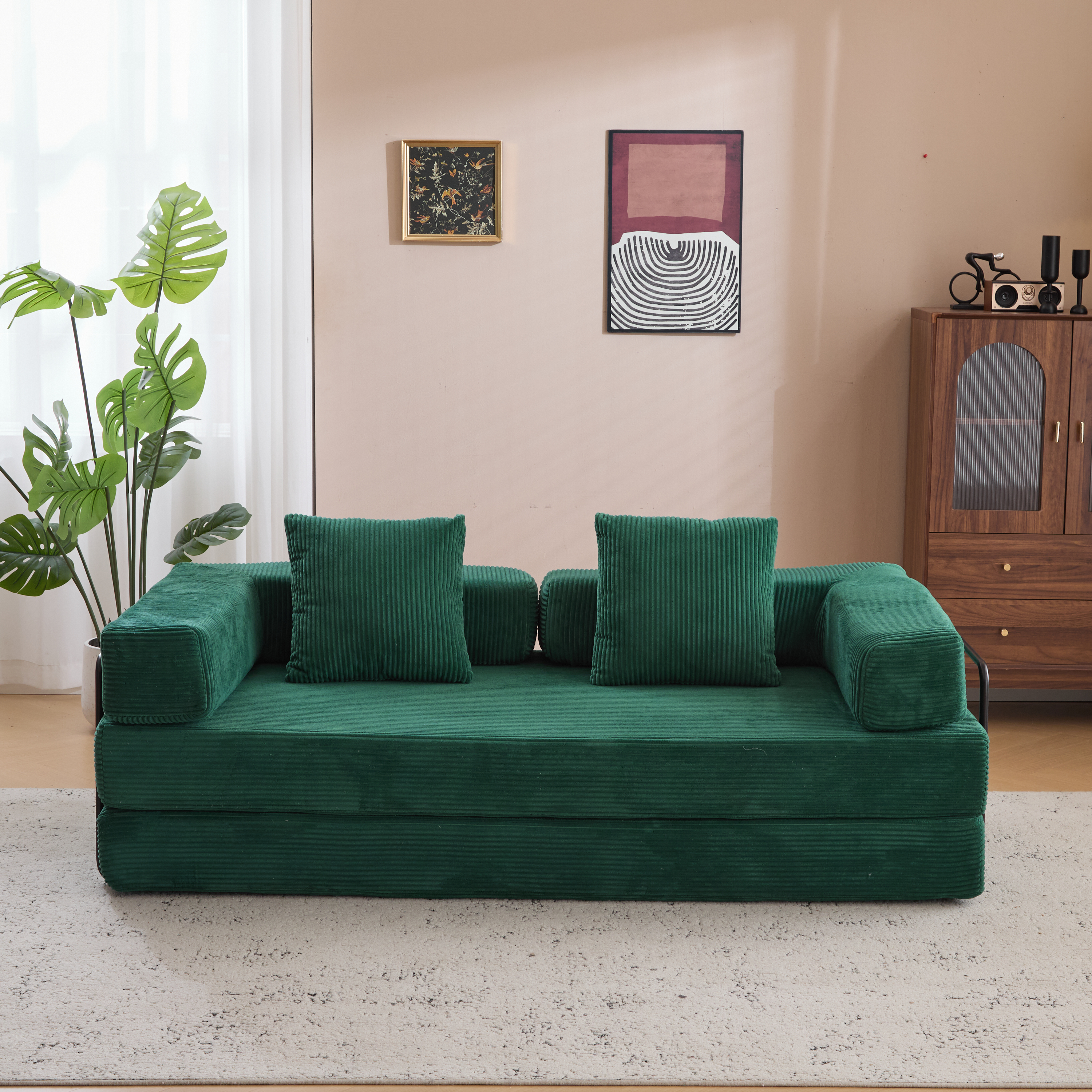 Specification Product Information Item Code:W3723P345018 Product Type :Single Box Product Product Name:Floor Couch,Compression Sofa,Convertible Floor Sofa Bed-with Pillow Back Support Armrest,Comfy Futon Couch Lounge Sleeper Bed,Corduroy Fabric,for Living Room Bedroom (dark green) Place of Origin:China Main Color:Dark Green Main Material:Corduroy Filler:Memory Foam Seats:3 Seat Product Dimensions Assembled Length (in.):76.77 Assembled Width (in.):37.40 Assembled Height (in.):23.62 Product Weight (lbs.):74.58 Package Size Outer Package Images Length (in.):39.17 Width (in.):15.55 Height (in.):16.33 Weight (lbs.):80.30 Product Features - •【Convertible Foldable Design】The futon sofa bed has 2 forms of floor sofa and mattress, it can be easily converted between bed and sofa by folding the side armrests or backrest, which can largely save your space and you don't have to worry about not having a place to sleep when your friends or family members come to visit you, it can be a suitable choice for your living room sofa.