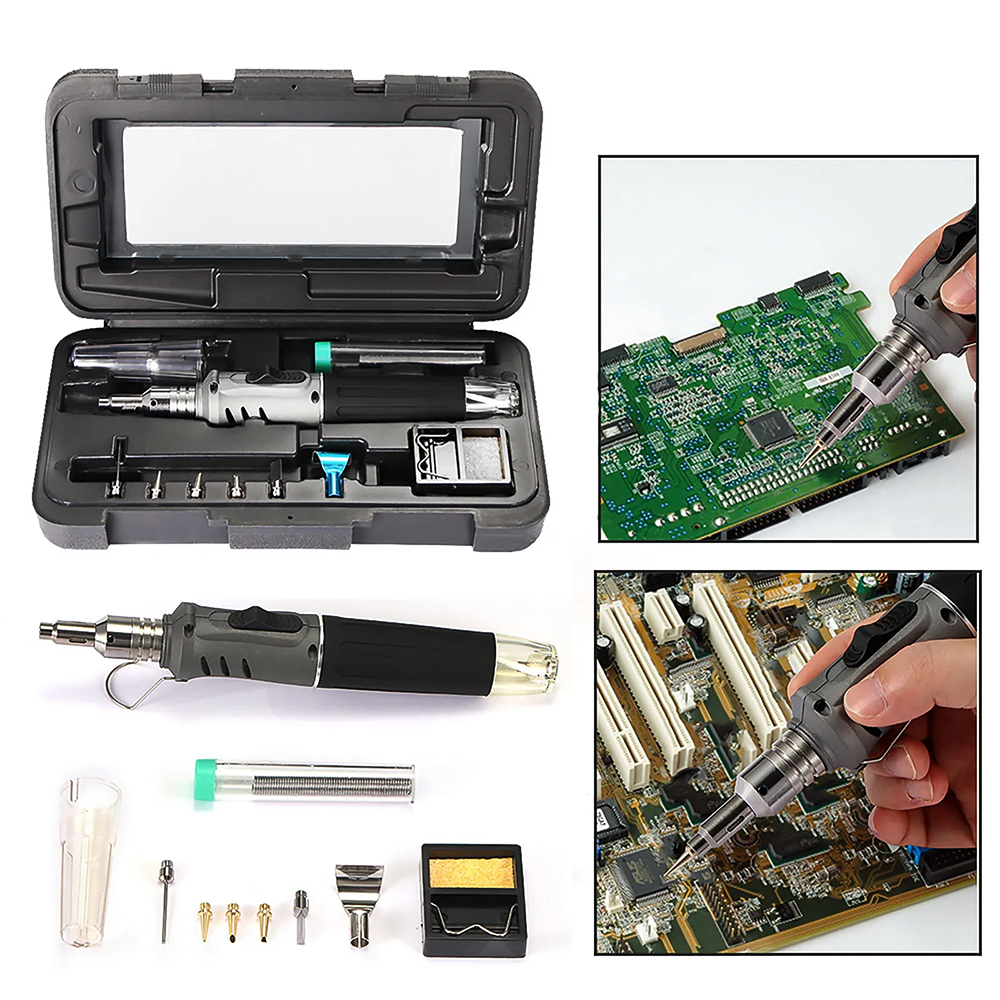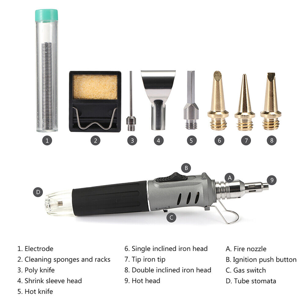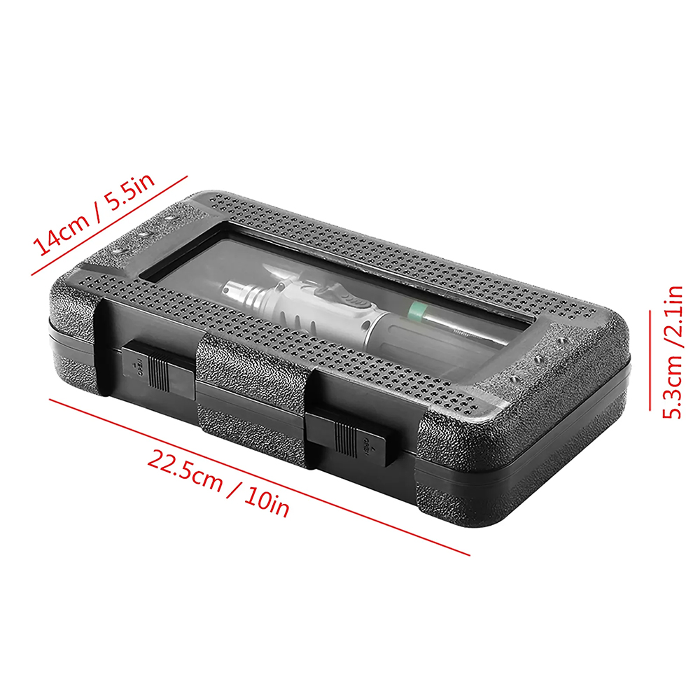 Features: Pen style design is unique and elegant. High capacity and excellent performance. With autoignition function for convenient use. Compact size, lightweight and portable to carry. Use gas as its power without voltage and wire limitation. Without location limitation. Can be used as ordinary soldering iron, heat gun or flame gun, very practical. Transparent design make you have easy access to inside gas. Specifications: Color: Grey + Black Material: Plastic Filling Capacity: 26ml Flame Temperature: 1300°C Solder Iron Temperature: 450°C Hot Blast Temperature: 500°C Use Time: 30-40 Minutes Item Weight: 401g / 14.16oz (with case) Item Size: 2.9 * 21cm / 1.14 * 8.27in(D * H) Case Size: 24 * 13 * 5cm / 9.45 * 5.12 * 1.97in Package Size: 27.5 * 13 * 5.5cm / 10.83 * 5.12 * 2.16in Package Weight: 456g / 16.1oz Note: The product is not filled with gas yet, please refill it before use. It's not used by open fire. The case color is sent randomly(black or blue), please in kind prevail. In case of open fire, please blow out the open fire once it happened. Improper operation could damage the device. Please read the instruction carefully before use! Package List: 1 * Blow Torch 1 * Soldering Tip 1 * Hot Knife Tip 1 * Needle Point Tip 1 * Double Edge Tip 1 * Engraving Tip 1 * Scoop 1 * Case 1 * Resin Core Solder 1 * Cleaning Sponge + Tray + Stand |