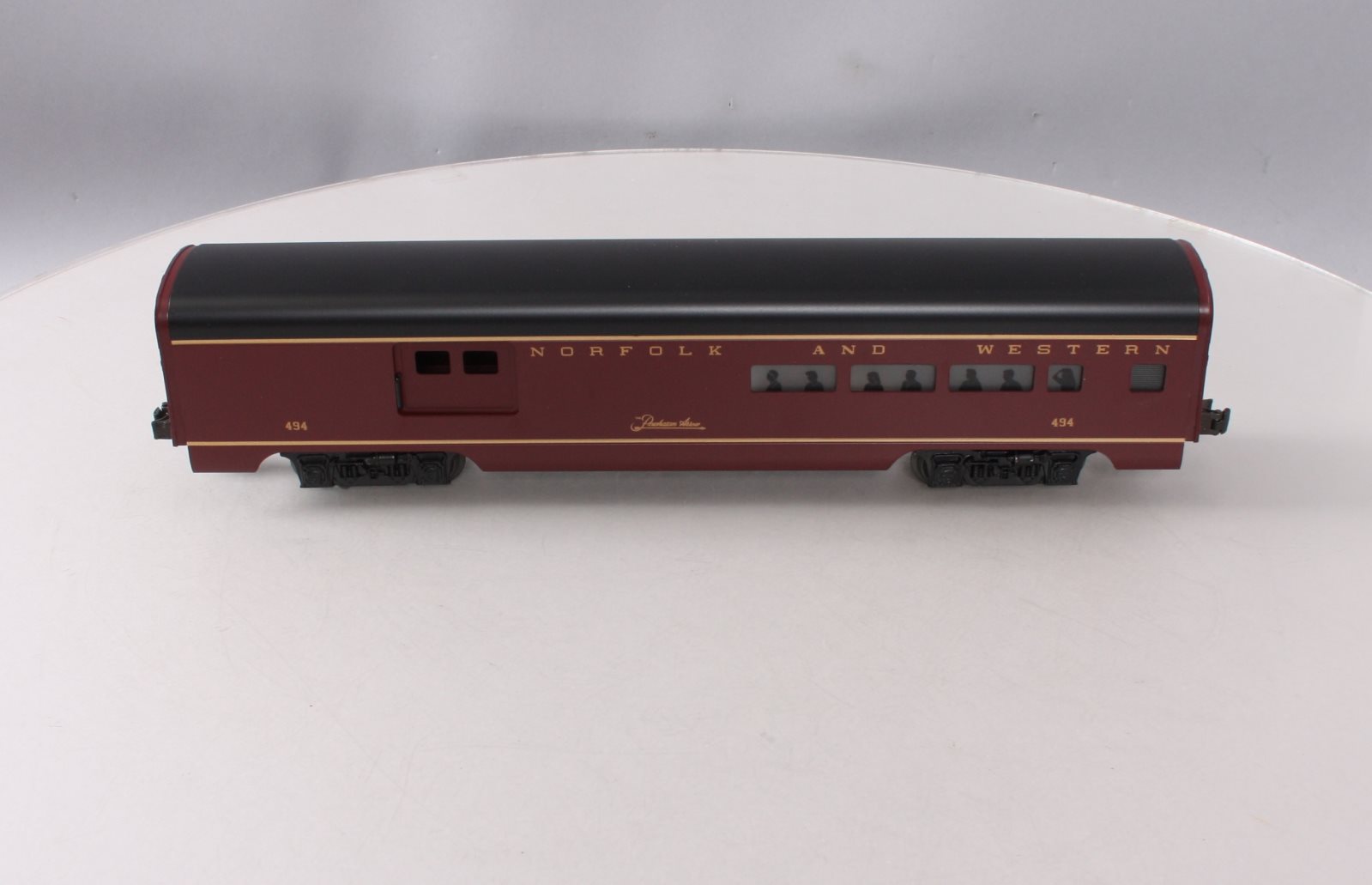 Here is a Lionel 6-19140 O Gauge Norfolk & Western Aluminum Combine Car #494. The body of the car is made of aluminum. It is lighted and also features metal trucks and operating couplers. It measures 15 inches long.