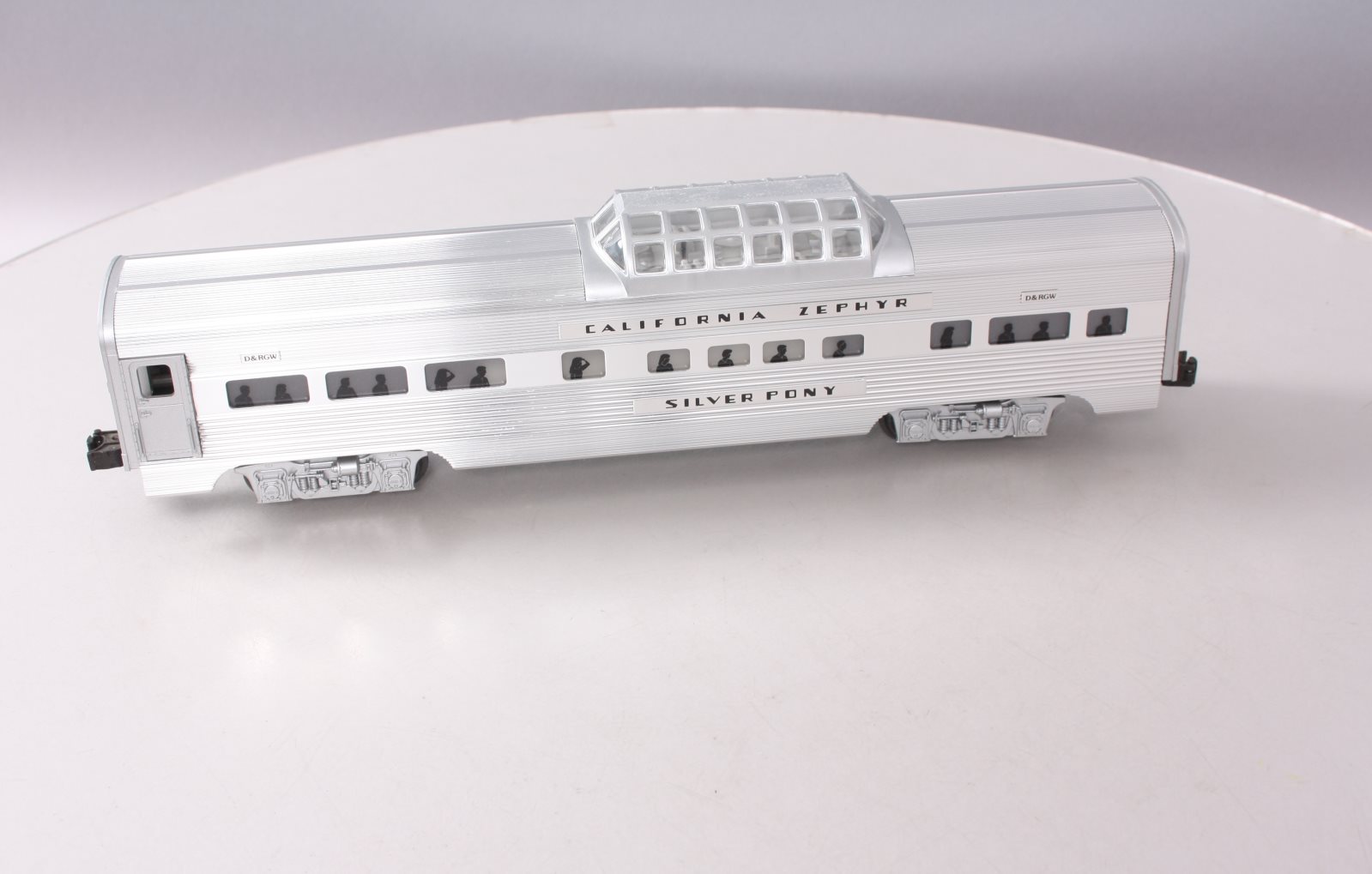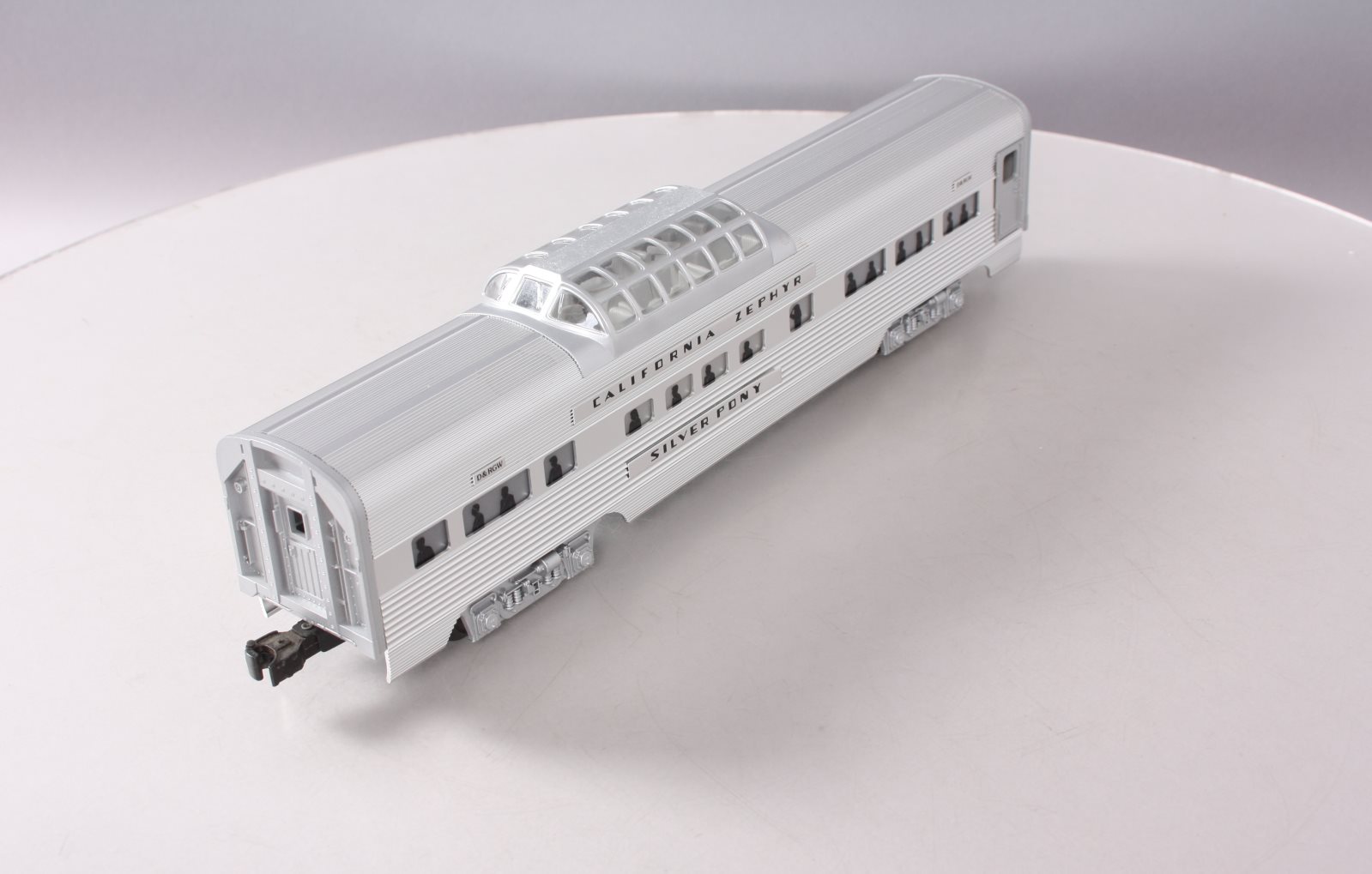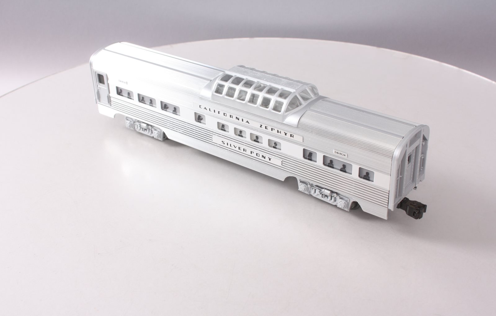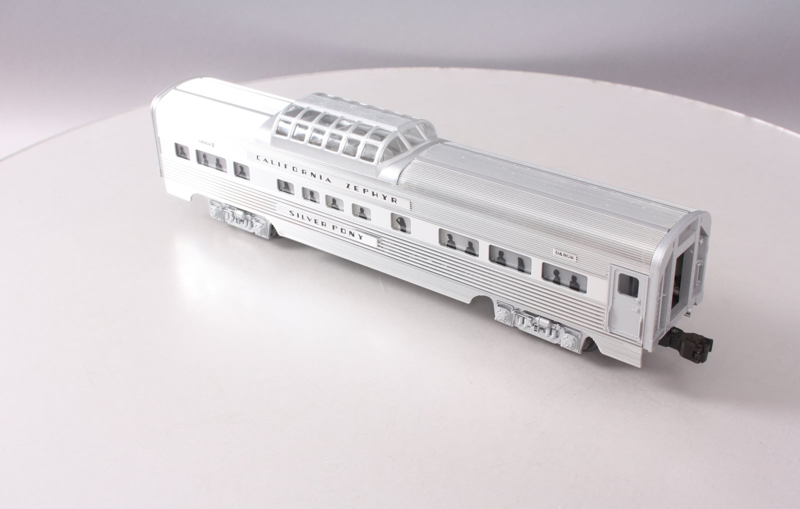 Here is a Lionel 6-19126 O Gauge California Zephyr "Silver Pony" Aluminum Vista Dome Car from 1993. This car features furniture in the dome, die-cast trucks with operating couplers and an illuminated interior with passenger silhouetted windows and measures 15 inches long.