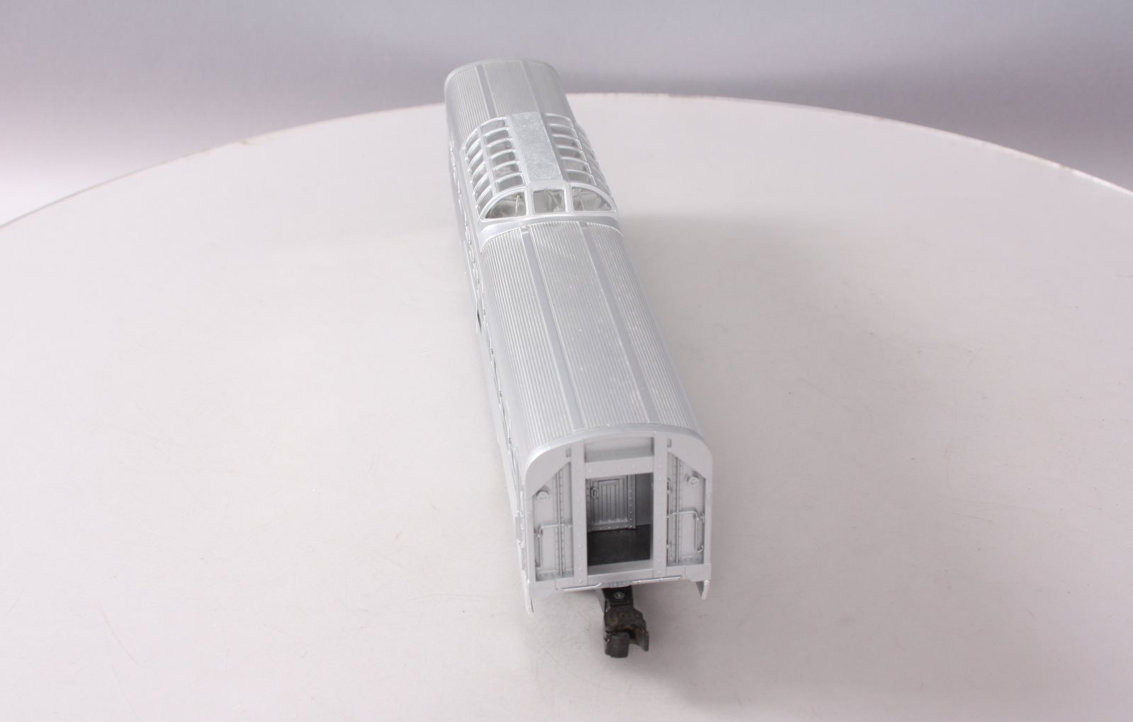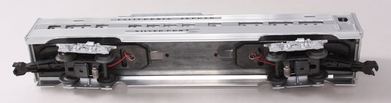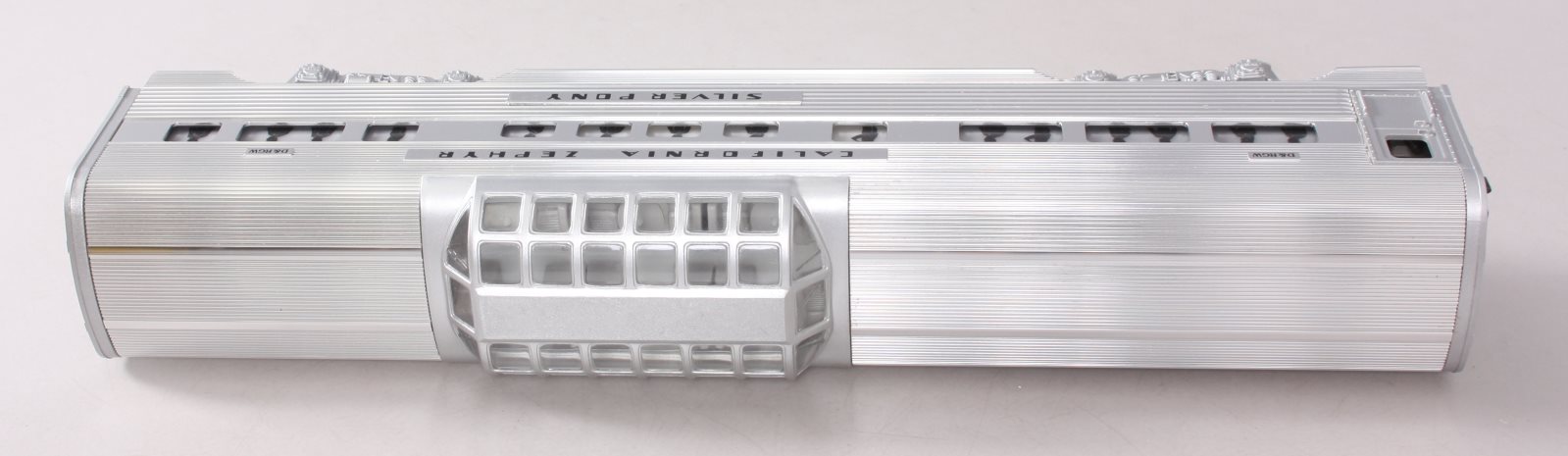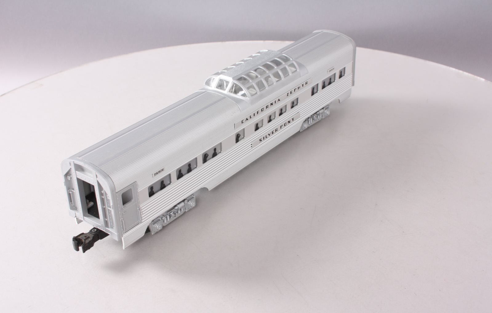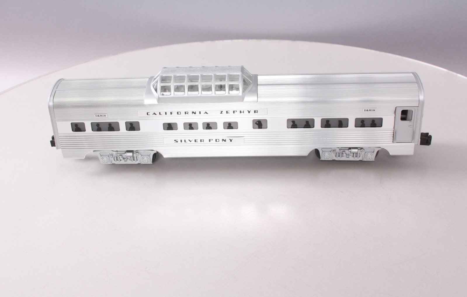 Here is a Lionel 6-19126 O Gauge California Zephyr "Silver Pony" Aluminum Vista Dome Car from 1993. This car features furniture in the dome, die-cast trucks with operating couplers and an illuminated interior with passenger silhouetted windows and measures 15 inches long.