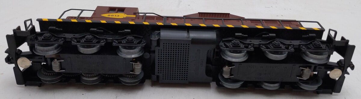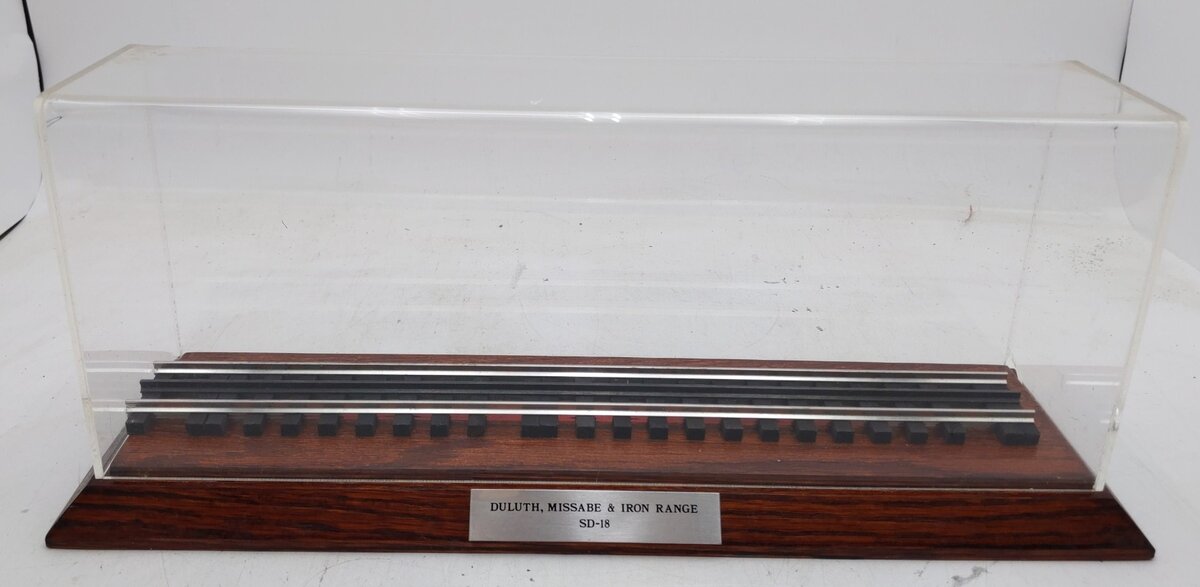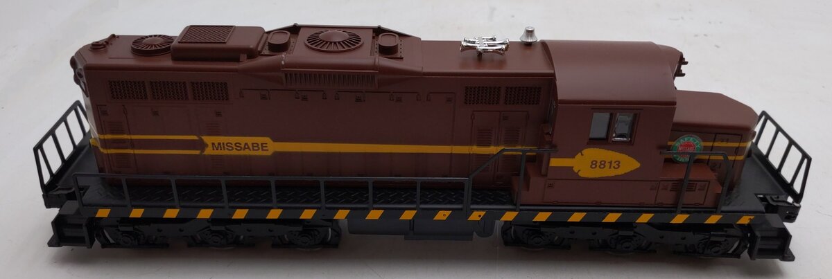 Here is a Lionel Duluth, Missabe & Iron Range SD-18 Diesel Locomotive 8813 from 1990. This was an uncataloged item that was made for a special order from JC Penney's and was also cataloged as model number 18552. It features an operating diesel horn, Long Life Motor that runs on AC or DC, metal wheels, operating headlight, and operating knuckle couplers, as well as Illuminated number plates. It comes with a clear plastic display case and a length of track with a wooden base.