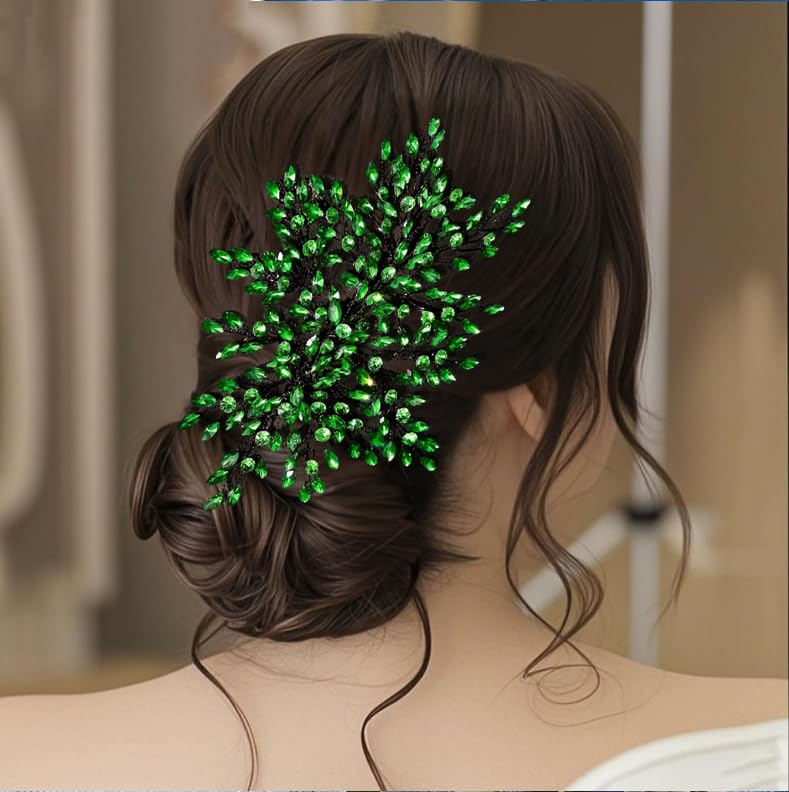 The leaf-shaped rhinestone hair accessory will flatter your face nicely and add a touch of glamour to the bride's look.