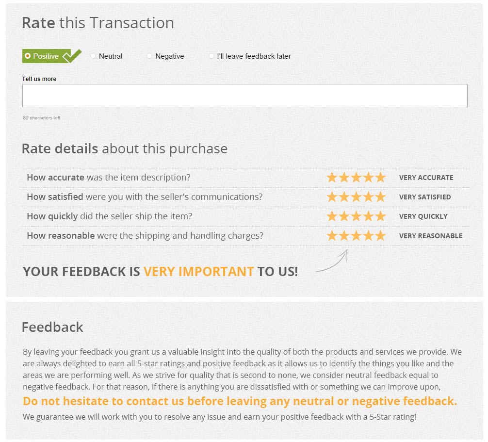 3.If you are satisfied with our service. pls kindly leave us a positive feedback and give us the Detailed Seller Rating with all"5 " in every area.