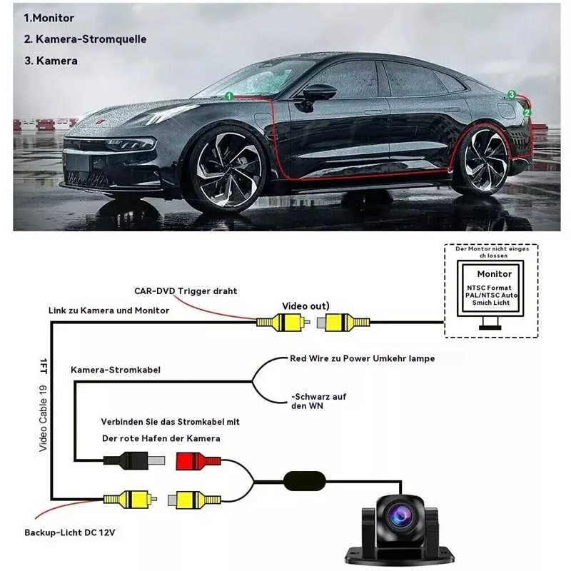 - Zum Anschluss einer Rückfahrkamera an einen Frontmonitor, geeignet für alle RCA-Composite-Videoanschlüsse.