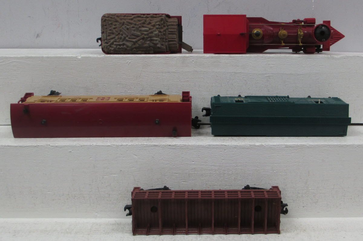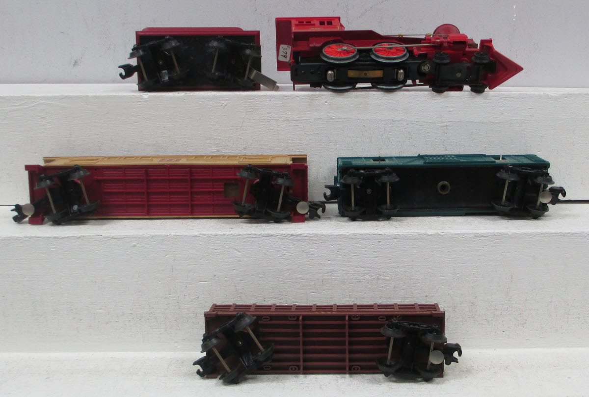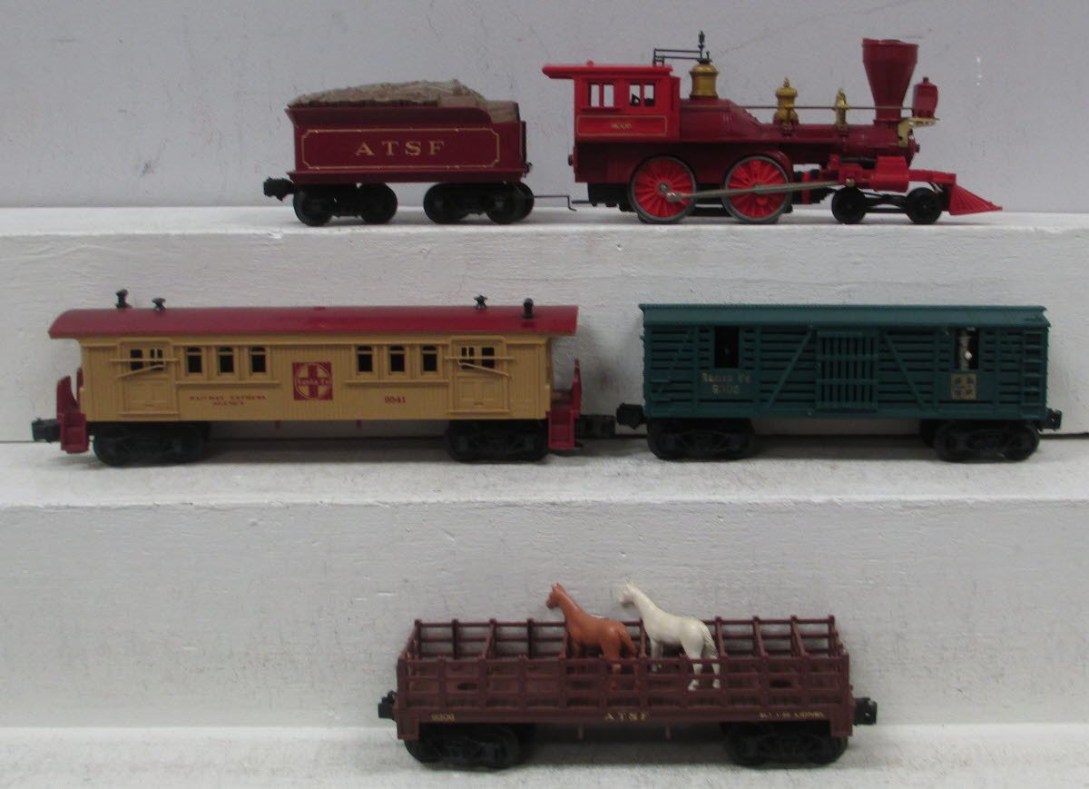 This is a Lionel 1053 James Gang Set. This set includes an Atchison, Topeka, & Santa Fe 4-4-0 Steam Locomotive and Tender, a #9305 Santa Fe Operating Cowboy Car, a #9306 ATSF Flatcar, and a #9541 Santa Fe REA Baggage Car. This set does not include track or a transformer.