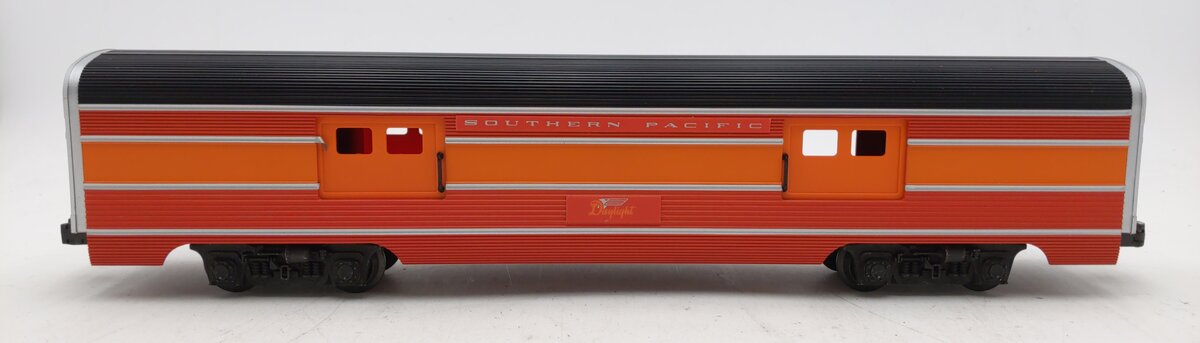 Here is a Lionel 6-9589 O Gauge Southern Pacific Aluminum Baggage car. This car is part of the Southern Pacific Daylight set from the 1980's. It features die-cast trucks with operating couplers and measures 15 inches long.