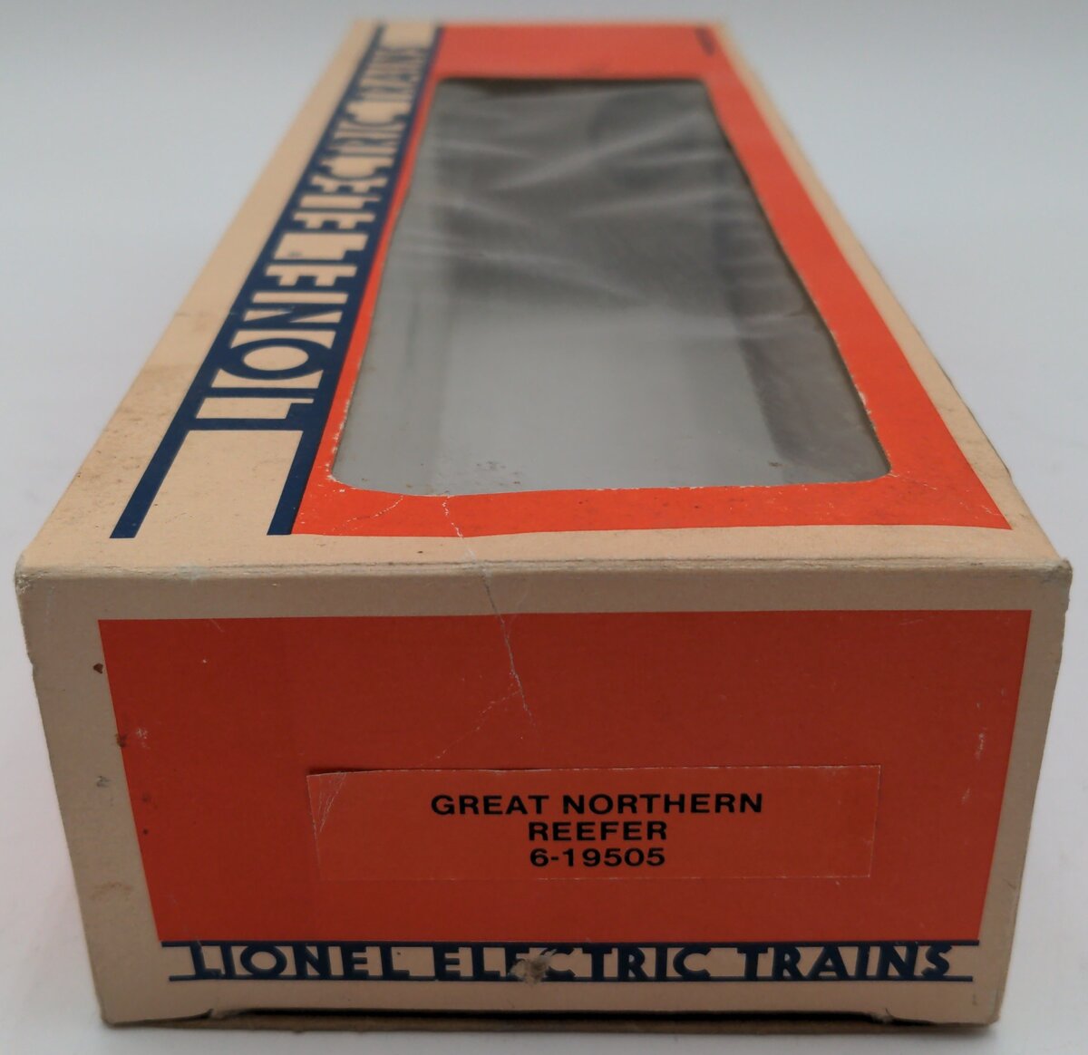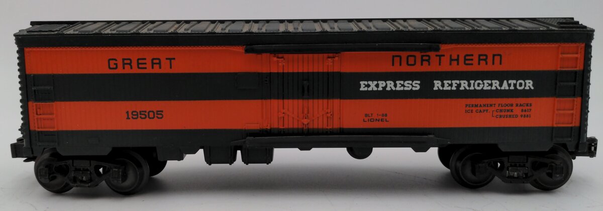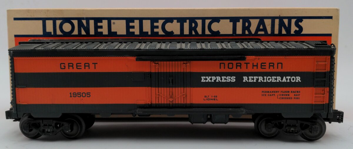 Here is a Lionel 6-19505 O Gauge Great Northern Reefer Car from 1988. This car is part of the Great Northern Fallen Flags set from that year. This car features sliding doors, die-cast metal sprung trucks, die-cast metal operating knuckle couplers, and metal wheels and axles.