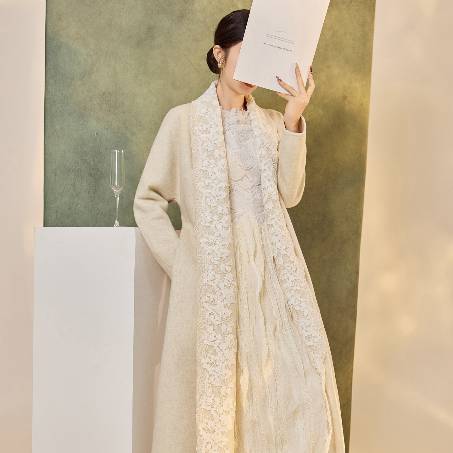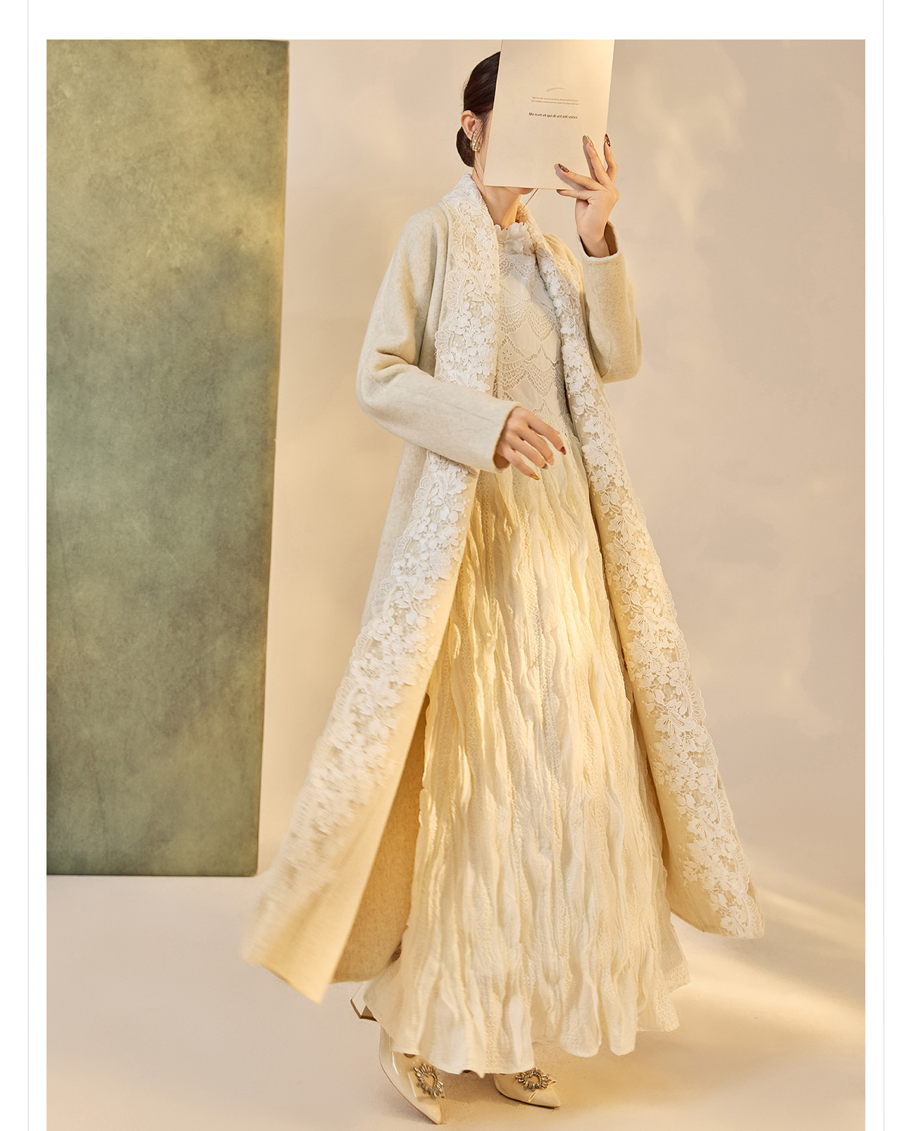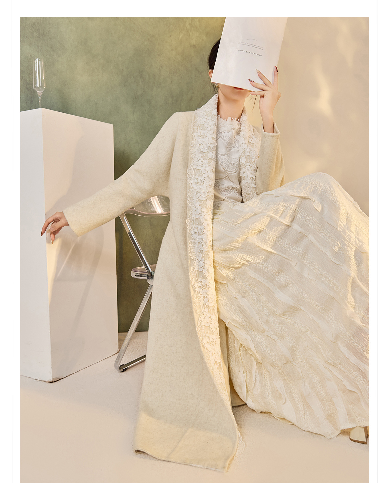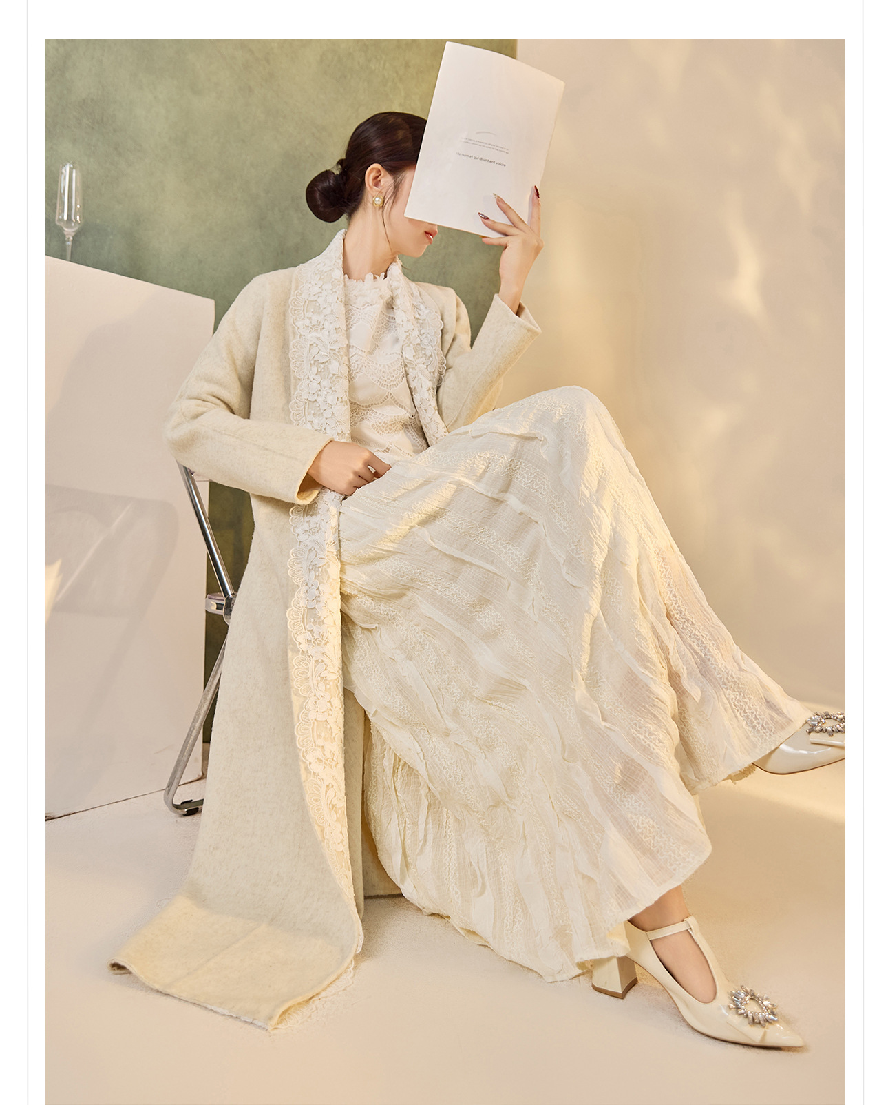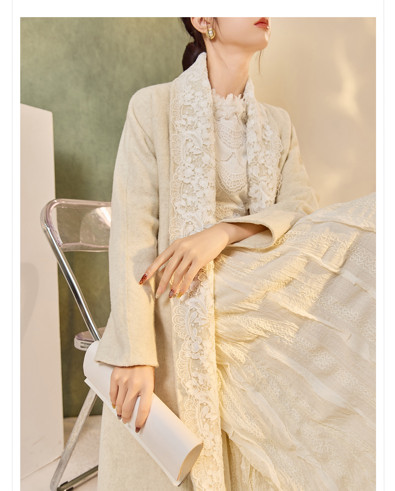 Winter Womens Cashmere Coat Chinese Style Lace Wool Coat Pleated Long Skirt Sets