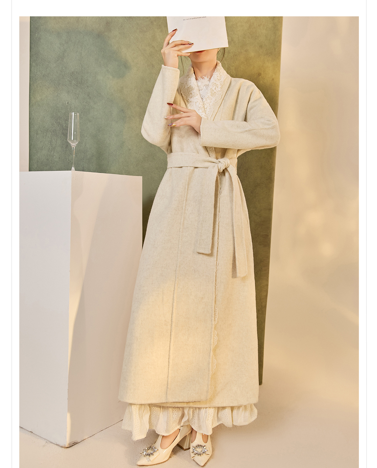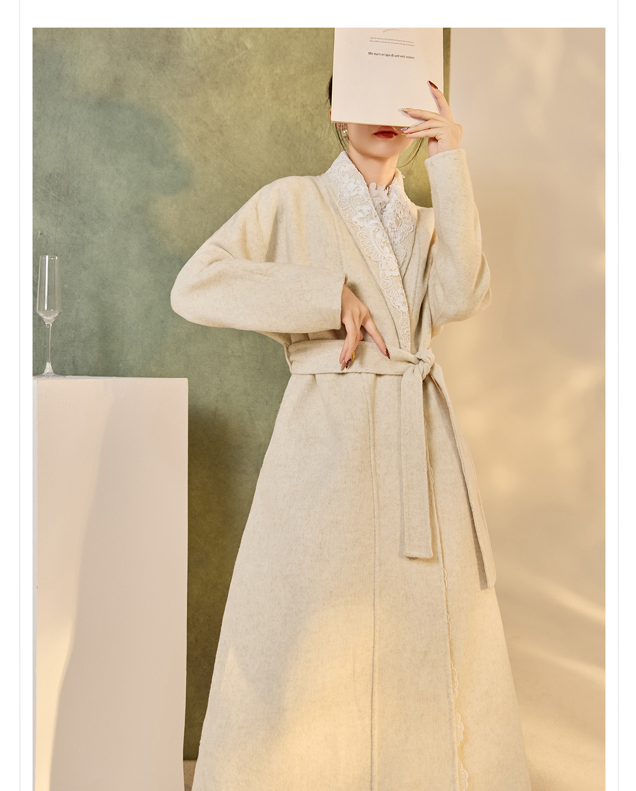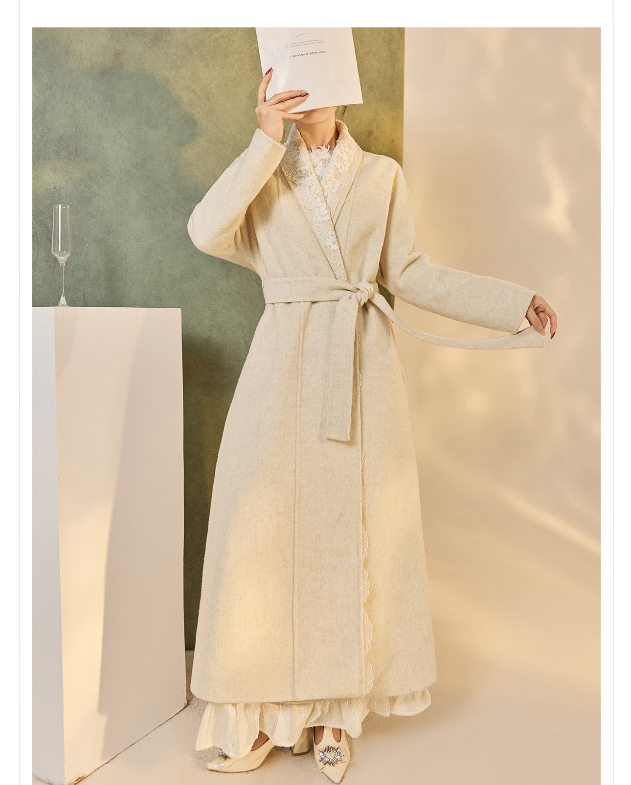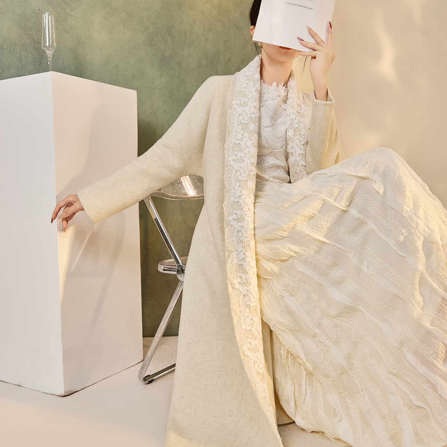 Winter Womens Cashmere Coat Chinese Style Lace Wool Coat Pleated Long Skirt Sets
