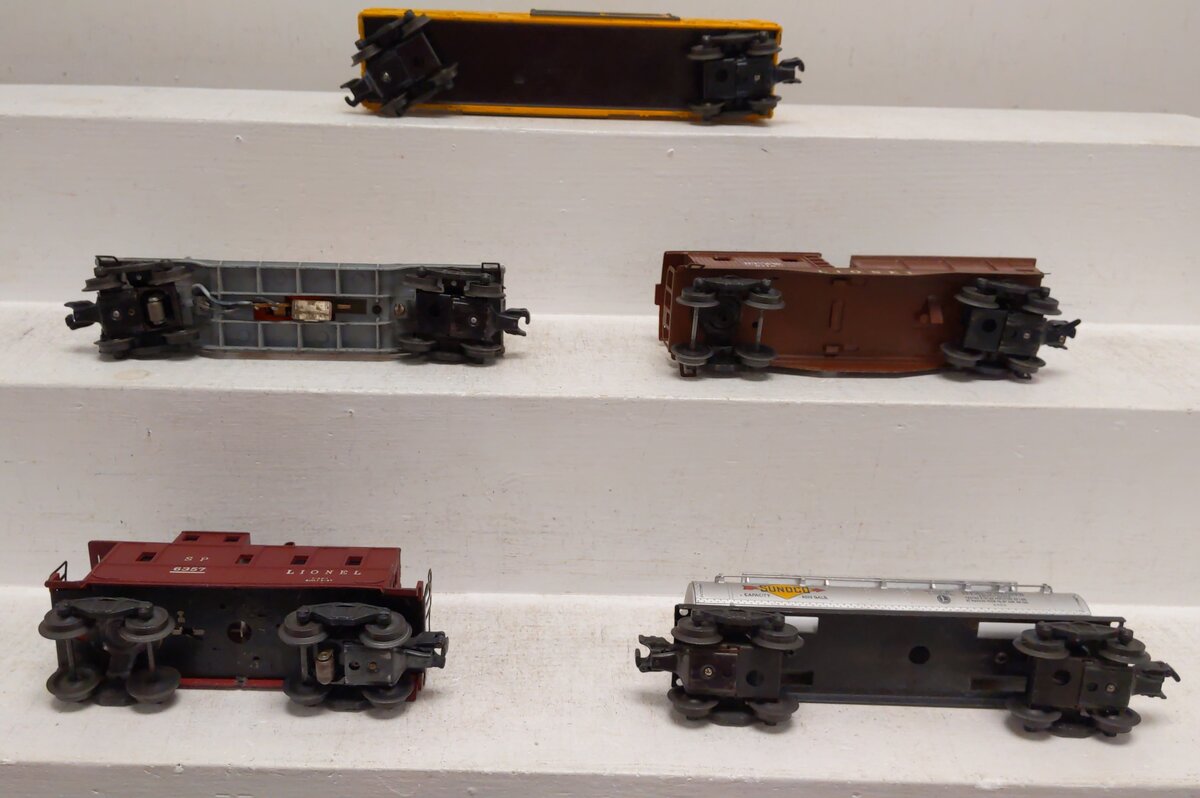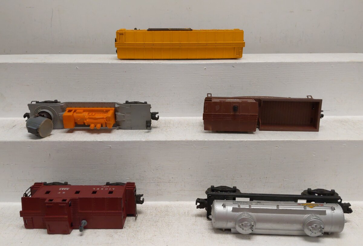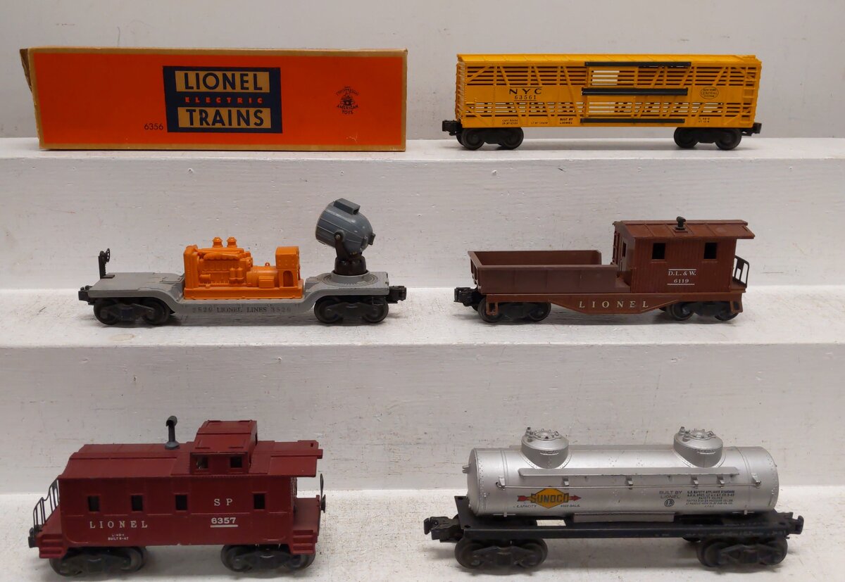 Here are 5 Lionel Vintage O Assorted Freight Cars: 6356, 3520, 6357, 6119 [5]. All items feature plastic or tinplate construction, die-cast trucks, operating knuckle couplers, and metal wheels and axles. Searchlight Car features an operating searchlight.