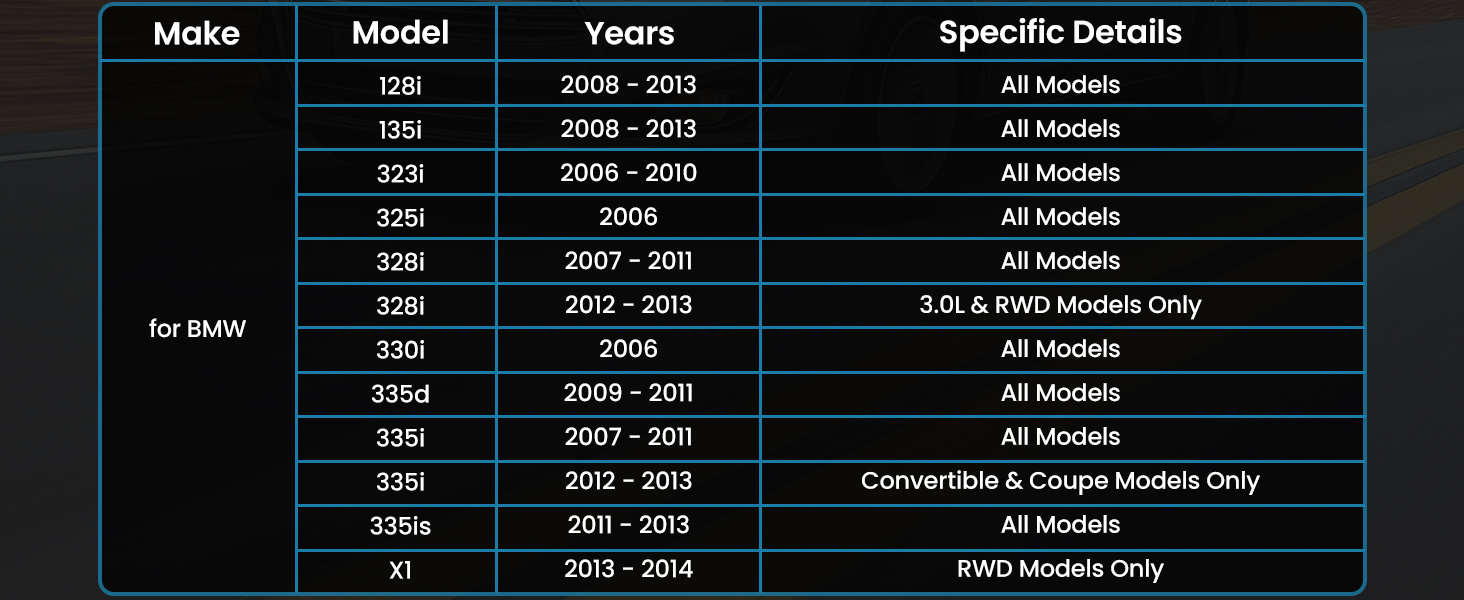 | For BMW | 328i 2012 - 2013 3.0L & RWD Models Only |