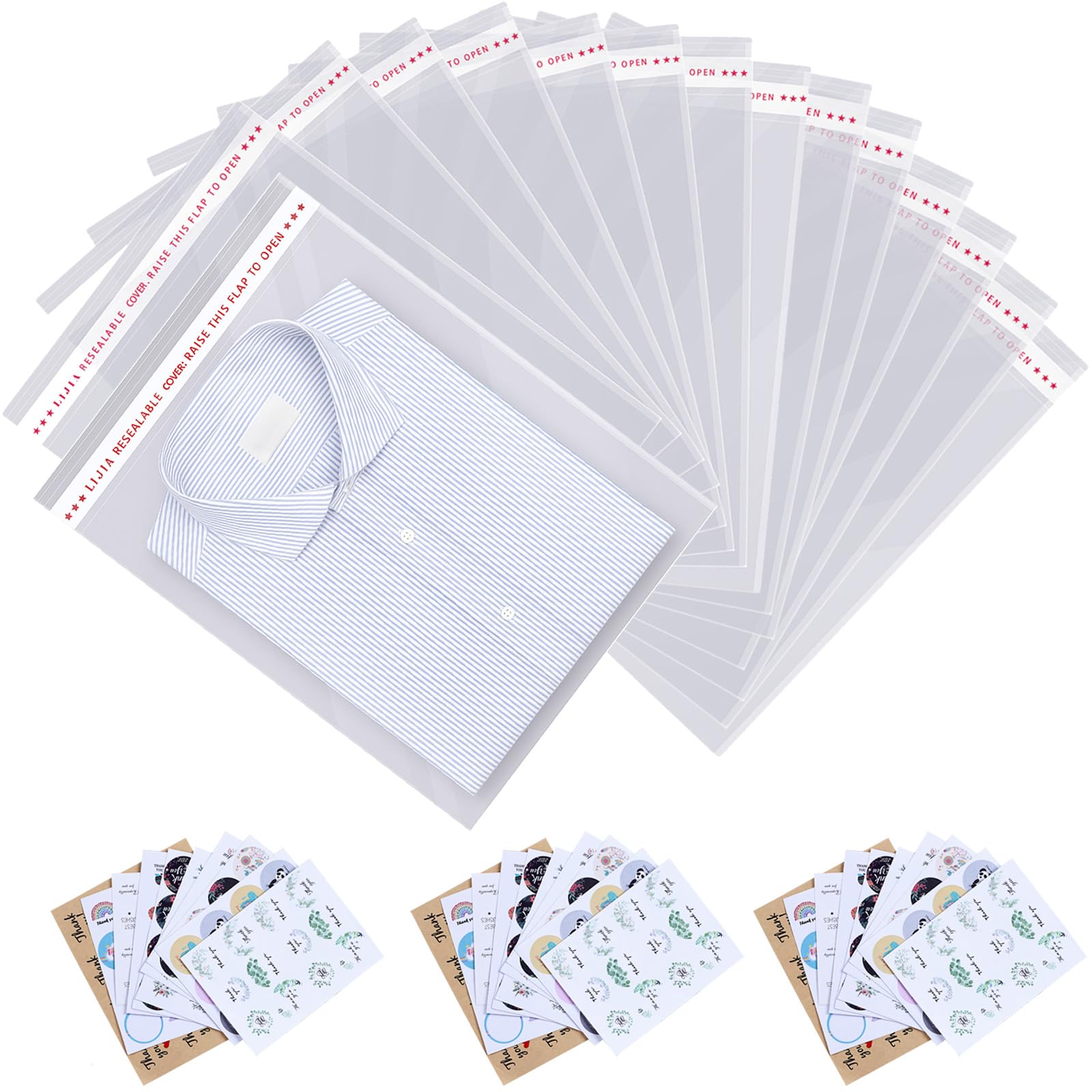 Measurement: Each of the large resealable cellophane bags is measured 14x20 inches in dimension and 1.97mil in thickness. The great measurement that can fit well for clothes and gifts.