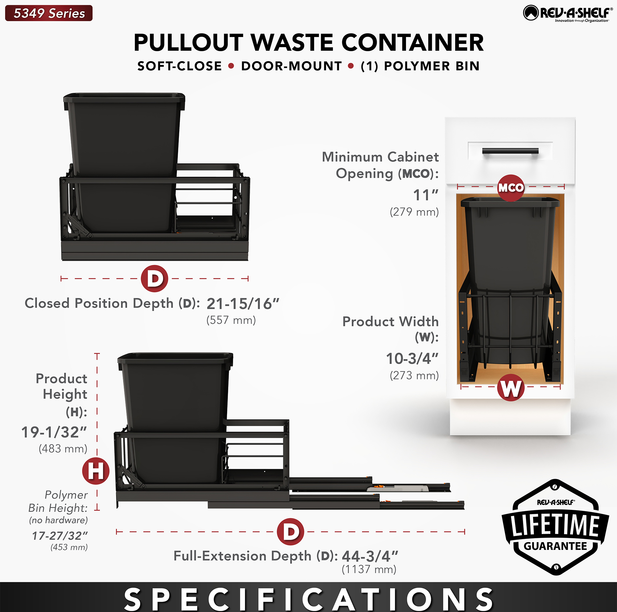 Upgrade your kitchen with the innovative pullout trash can solution Rev-A-Shelf's 5349 series provides. Tailored for under-cabinet use, this under-counter garbage bin seamlessly integrates into your kitchen, allowing for a tidy and organized space. With its discreet under-mount design, this kitchen hideaway optimizes space, ensuring your counters remain clutter-free and functional. Experience the convenience of effortless waste disposal with the smooth gliding and soft-closing feature, making kitchen cleanup a breeze. Say goodbye to unsightly trash bins and embrace the streamlined elegance of this under-cabinet waste management solution.
