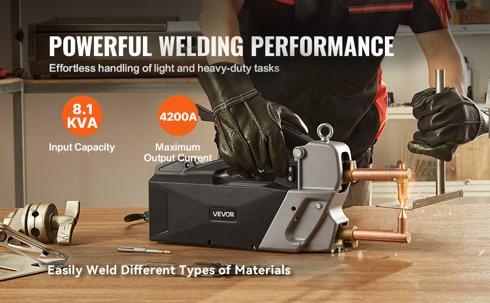 La saldatrice a punti portatile salda in modo efficiente lamiere di acciaio fino a 4 mm di spessore (come l'acciaio al carbonio). Con una potenza nominale di 8,1 kVA e una corrente di uscita massima di 4200 A. (Non adatta per alluminio e acciaio inossidabile)