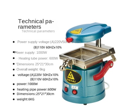 1pc JT-18 220V/110V Dental Vacuum Former Molding Machine 1000W Dental Equipment Professional Quality Guaranteed Features : 1,bleaching braces forming and fabrication ; 2, maintaining orthodontic appliances , dental splint molding and production ; 3, periodontal disease, fluoride treatments tray molding and production ; 4,temporary , permanent denture base , mouthpiece care molding and production ; Instrustions: 1, first pull rod , and then plaster model trimmed in a vacuum online . 2, the film on the mezzanine , tighten the screw button. 3, open the heating switch observed softness film until the film is heated evenly. 4 , the lever depressed after heating the soft film covering the plaster model 5, turn off the heating switch , turn on the vacuum switch ,vacuum for 10-15 seconds , braces can be formed. 6 , the first film outside the pen to draw marked by gingival margin . 7 After cooling the film with scissors or grinding to remove excess film by Mark completed bracesDetails : Remain transparent orthodontic appliances or without clasp , beautiful, wear comfortable, remain stable, and simple production by the majority of dentists welcome,Different from the first use of the tool : plastic sheet vacuum forming machines and special . Hard plastic sheet used in orthodontics , the choice of 0.8mm ~ 1.5mm. 1,get an press mould 2, filling gypsum, plaster casts upon dry dressing models ,remove the bottom part of the palate and tongue should be the best it into a "U" . 3, Place the slices on a molding machine , clamping , jumping heated place.Then take the model into the vacuum forming machine vacuum suction machine . 4, slices of hard vacuum machine heater heating , let depression about 2 cm . The deeper the recess , the holder will be thinner .Put it down on the model until it is fully in place. 5, vacuum suction machine for 15-20 seconds to ensure molding.Remove the heater , which will be cool to remove it die . 6, Use scissors to trim off the excess , or burs directly along the gingival margin under 2 ~ 3mm under its grinding, trimming the edges , reserves the gingival margin 0.5 mm 7, braces after pruning is completed, the braces placed on the model again to check fit . Such an orthodontic retainer will be made , and if that edge is not close together,you can use alcohol lamp bake it, inward until close together.The same way, the choice of different thickness and hardness of the plasticsheet can be made whitening dentures , bruxism pad. Note:Other type of this kind machine for optional