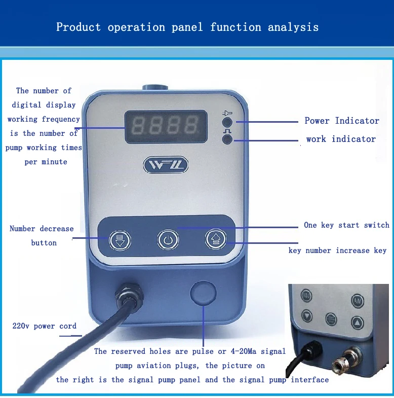 Manual adjustment of the working frequency of the metering pump, optional liquid level probe interface. With power-off reset or power-off hold function