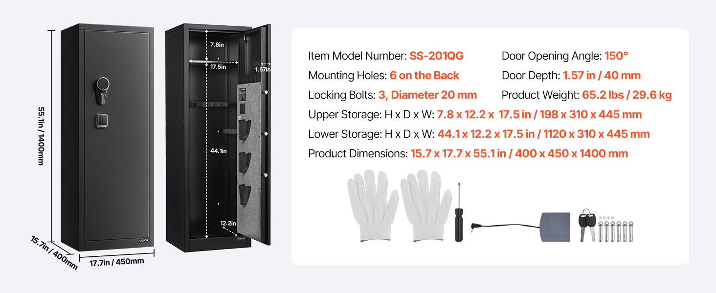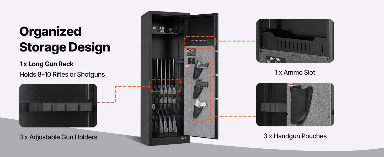 Può contenere fino a 8-10 fucili/fucili da caccia e almeno 3 pistole, soddisfacendo così le esigenze di stoccaggio di collezionisti esigenti e utilizzatori di più armi da fuoco. Dotato di 3 supporti regolabili, consente la personalizzazione della disposizione interna.
