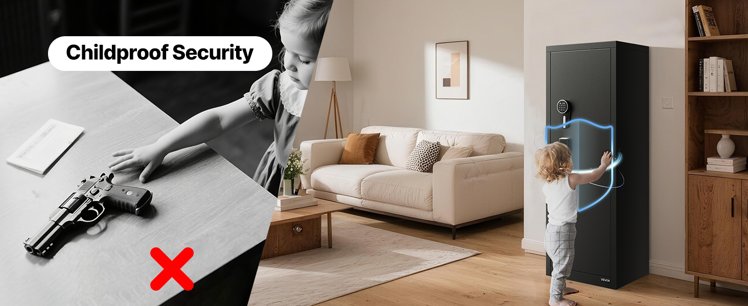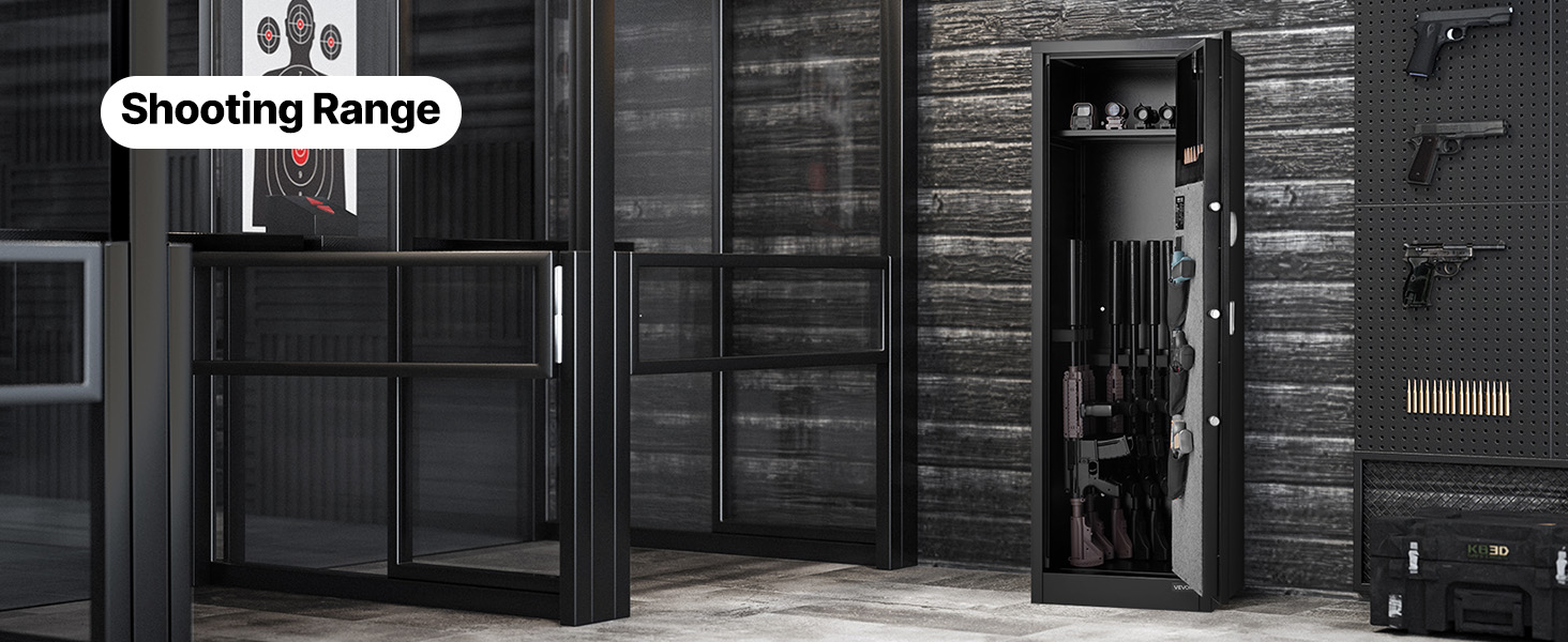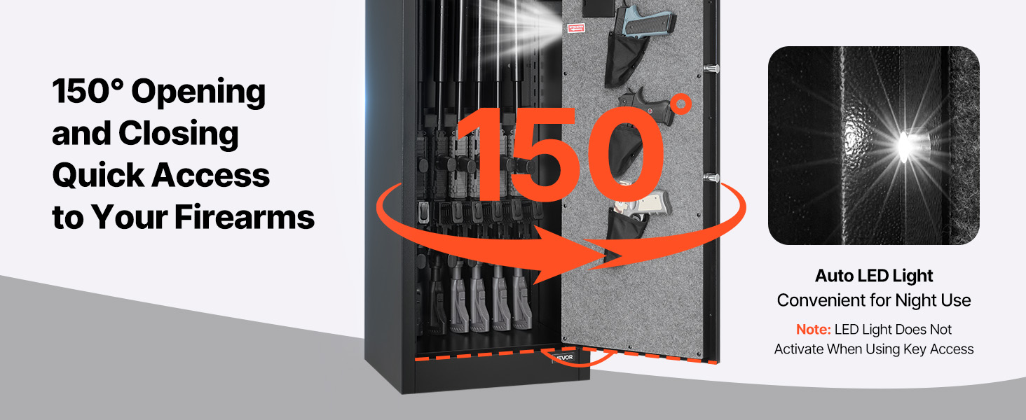 - Accesso rapido: la porta grandangolare a 150° si apre completamente per una visuale libera su tutte le armi da fuoco. L'interno è dotato di illuminazione LED automatica, che garantisce visibilità ottimale in condizioni di scarsa illuminazione