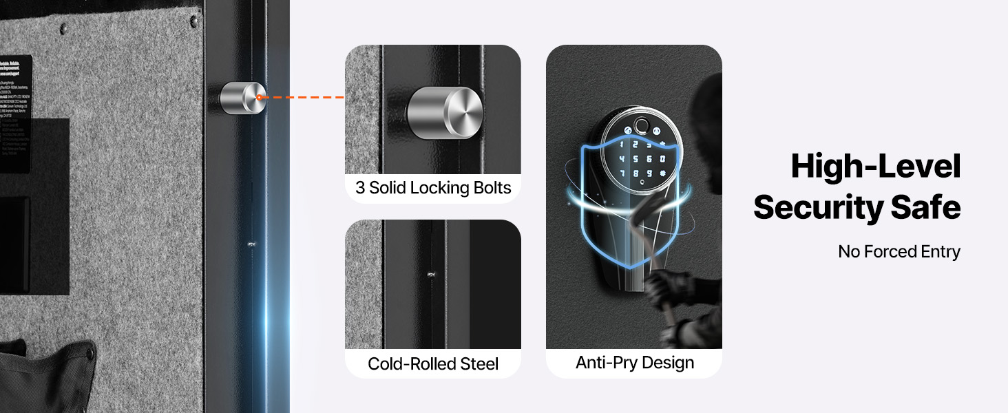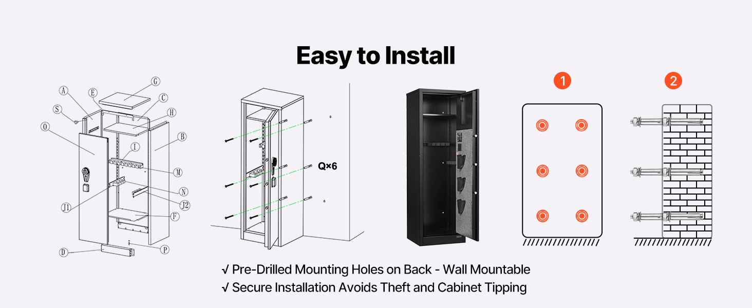 - Armadio robusto e antieffrazione: cassaforte per armi è realizzata interamente in acciaio con una piastra antieffrazione spessa 1,1 mm e tre robusti bulloni di chiusura. I fori di montaggio preforati sul retro consentono il montaggio a parete