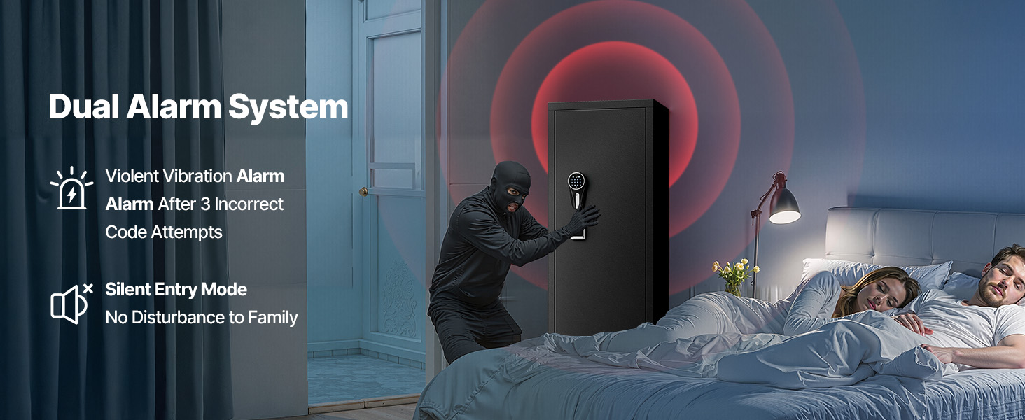 - Sistema di allarme e modalità silenziosa: il sistema attiva automaticamente un allarme se viene inserita una password errata per tre volte consecutive o se l'armadietto porta-armi viene manomesso. Per attivare la modalità silenziosa