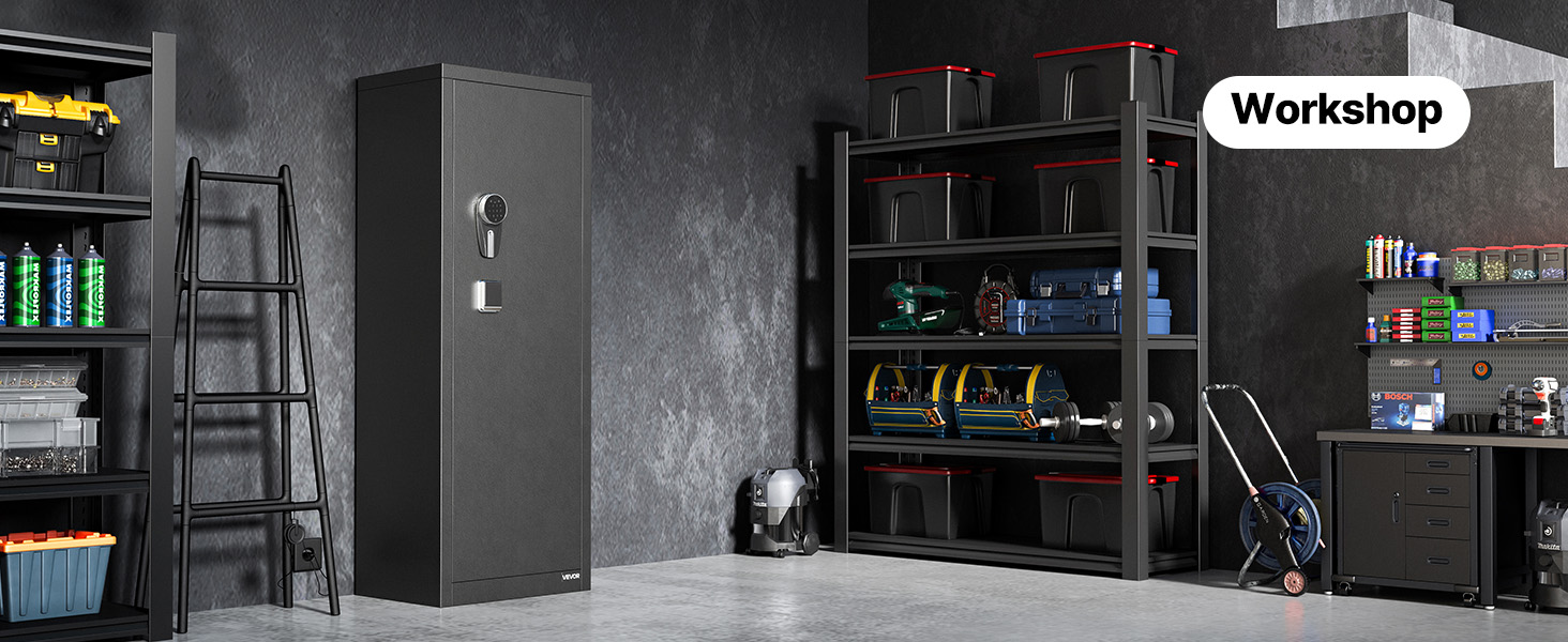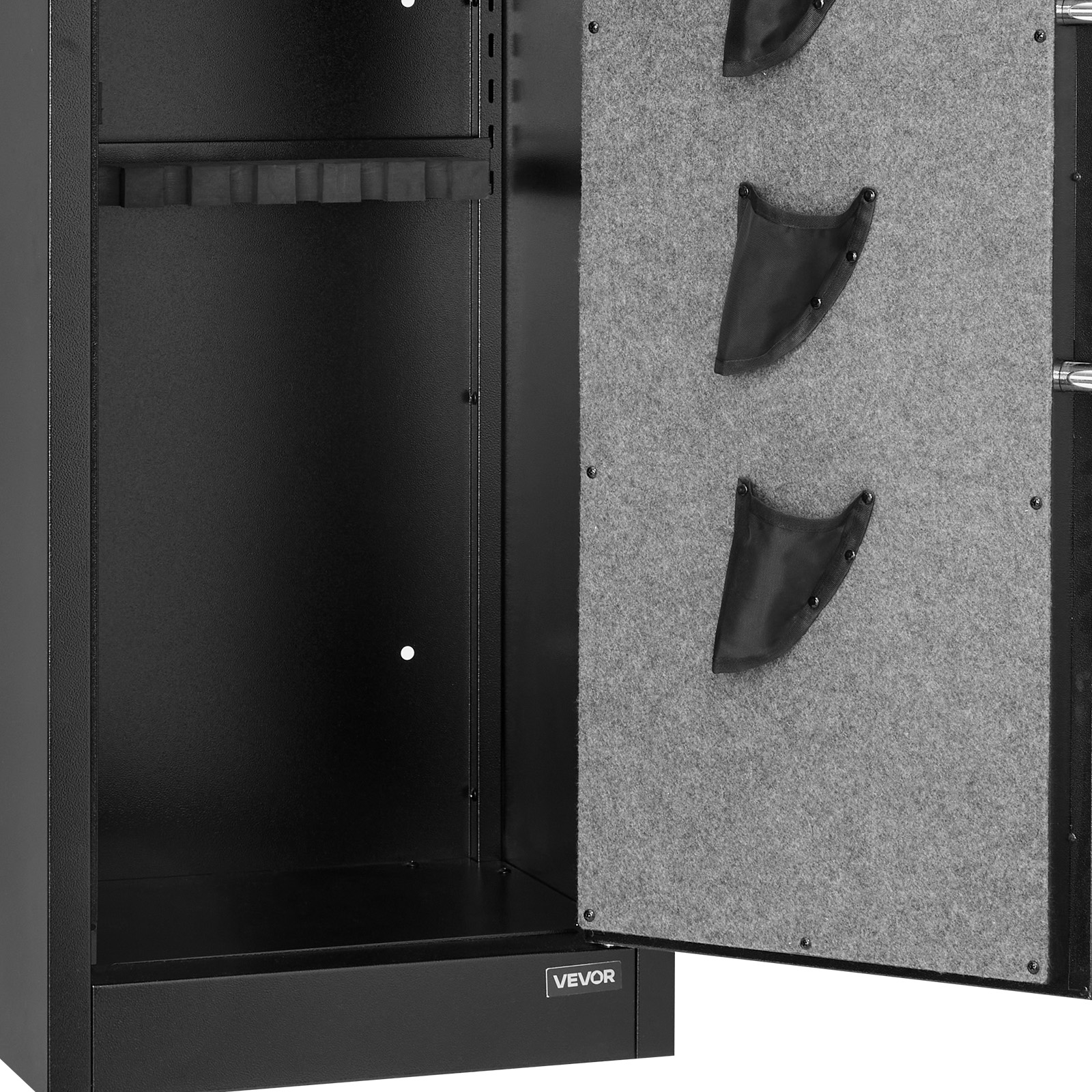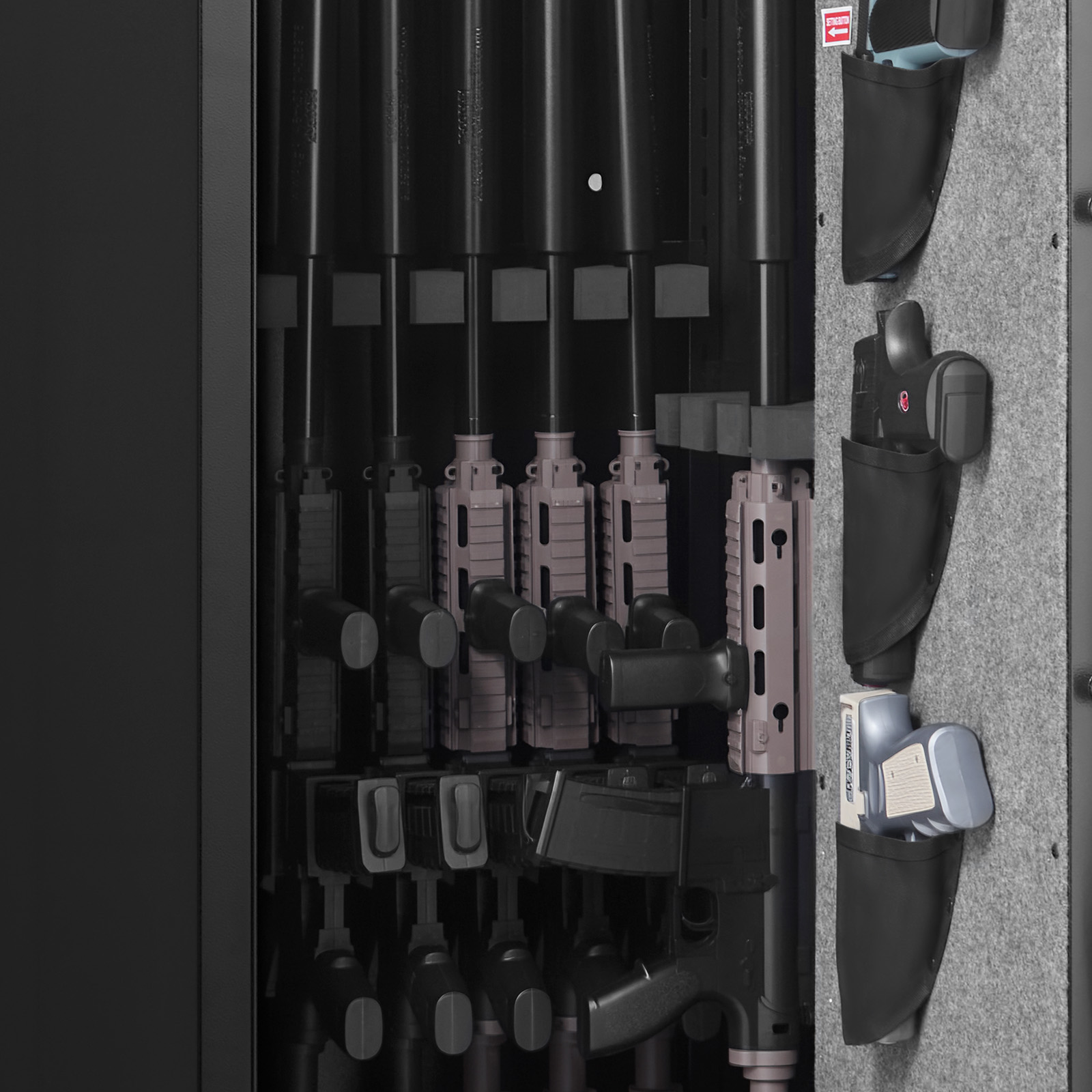 - Cassaforte di grande capacità: Assemblaggio richiesto. Questa cassaforte può contenere da 8 a 10 fucili o carabine ed è dotata di una tasca per tre pistole, un vano per le munizioni e tre supporti regolabili. Permette di riporre armi da fuoco e accessori