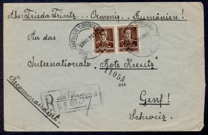 ROMANIA 1943 REGISTERED CENSOR TO SWITZERLAND. Front and back shown.