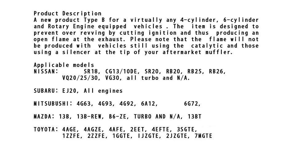 Beschreibung:Der Builder Typ B Rev Limiter ist ein neues Produkt, das für die meisten Fahrzeuge mit 4 Zylindern, 6 Zylindern und Rotationsmotoren entwickelt wurde.Es verhindert eine Überdrehung durch Schneiden der Zündung und erzeugt Flammen aus dem Auspuff.