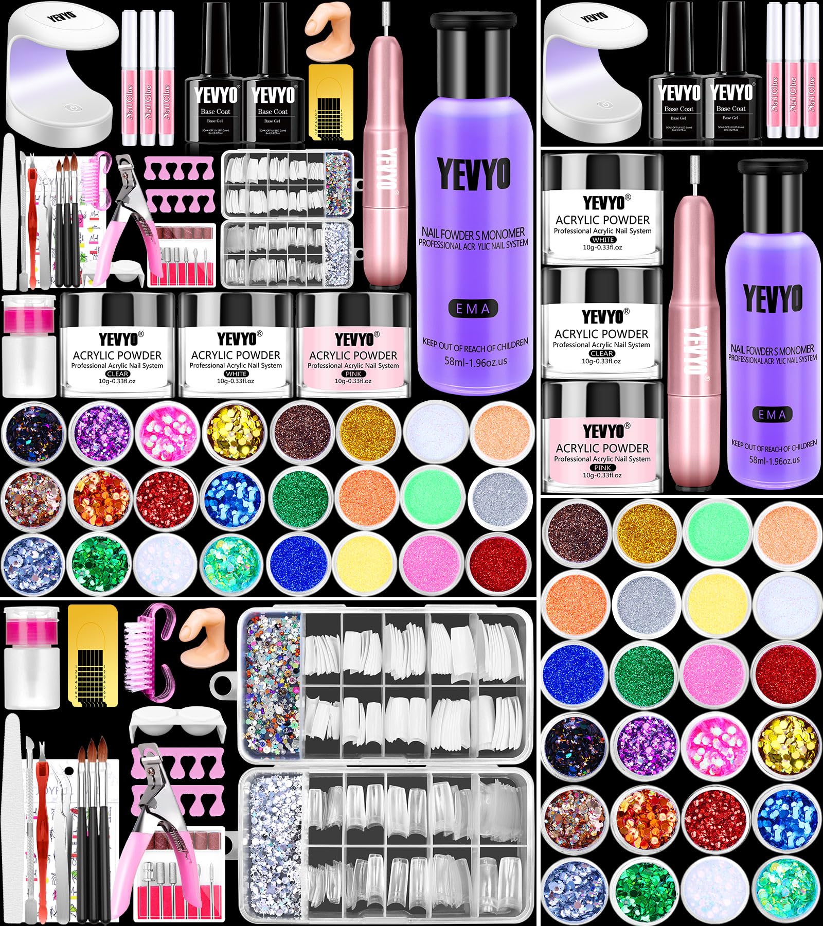 All-In-0ne Acrylic Nail Kit: YEVYO nail kit for beginners with everything, comes with acrylic powder(15g), acrylic liquid monomer(3.38OZ), nail drill, mini uv nail light, 24 colors of glitter powder and sequins, colored nail rhinestones, 200pcs various size nail tips, acrylic nail brush and other nail tools. You can choose different colors, patterns and designs according to the occasion to better meet your needs for designing personalized nail art.