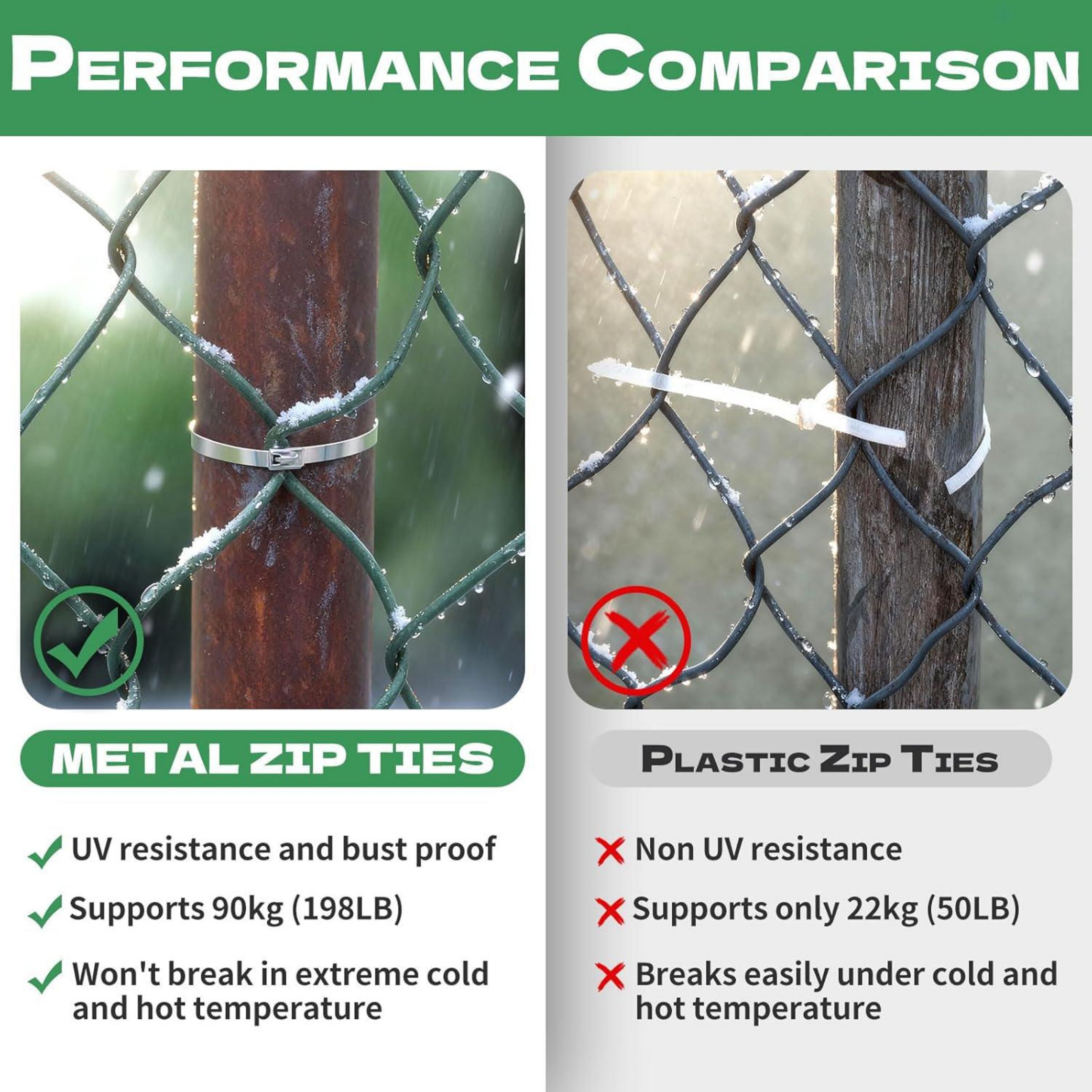 Each 10.6-inch steel zip tie supports up to 200 pounds of tensile strength, ensuring a firm and reliable hold for exhaust pipes, fences, cables, and heavy-duty wiring setups
