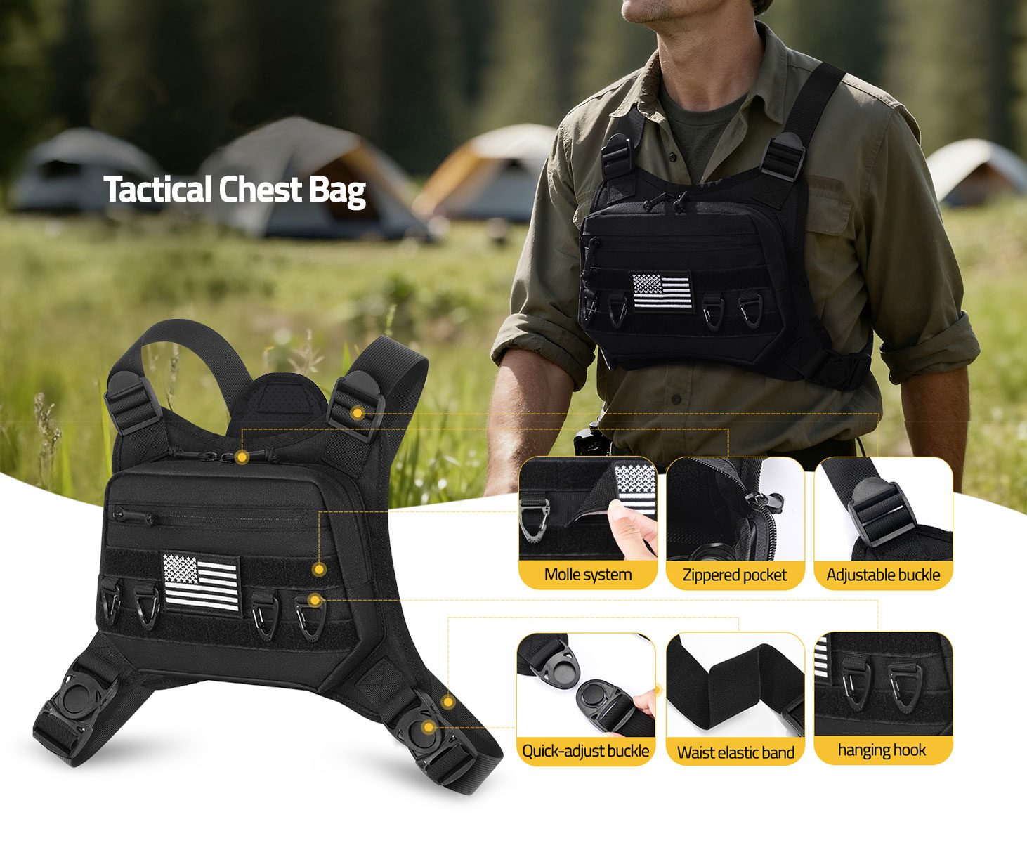 Nylon and Elastic Fabric:The molle chest bag is made of nylon, which is wrinkle-resistant and tear-resistant.The elastic webbing on waist increases the flexibility of use